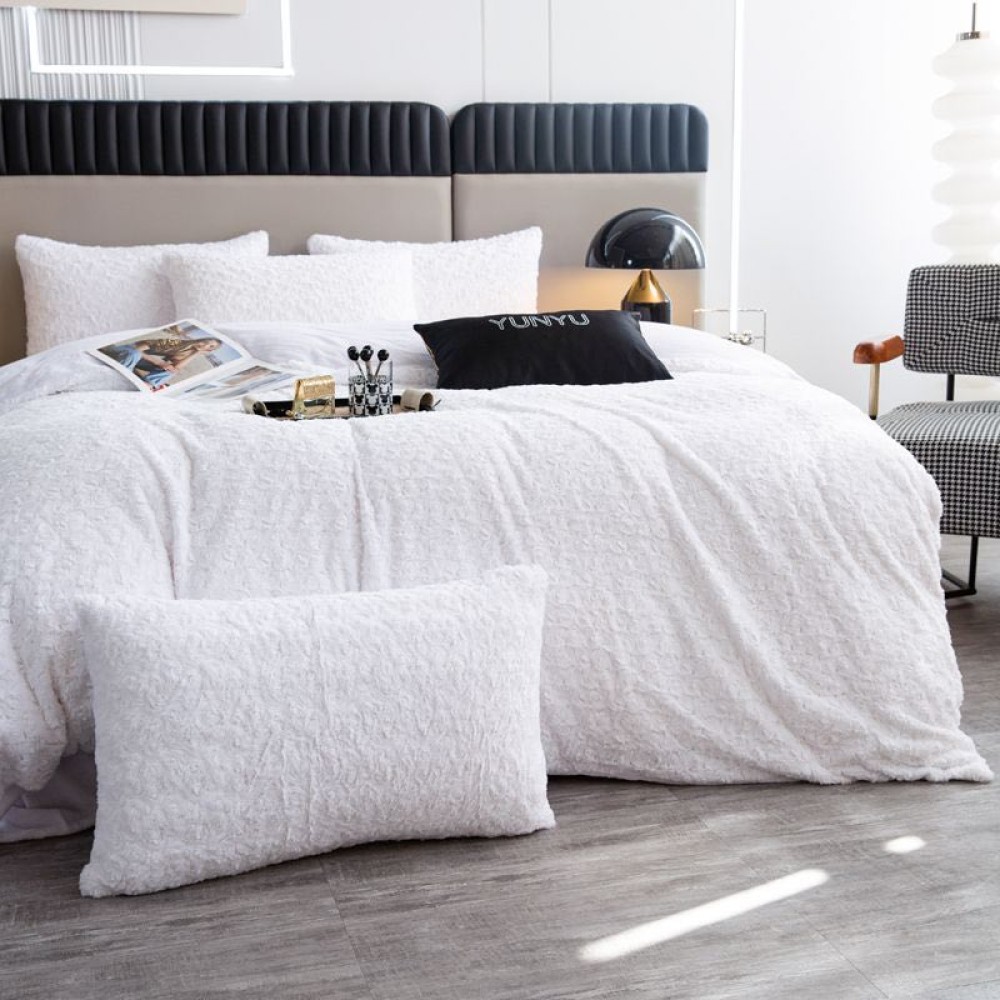 Această lenjerie de pat se remarcă prin designul său captivant, cu trandafiri în relief, ce adaugă o notă subtilă de romantism în dormitorul tău. Fiecare petală este conturată cu atenție pentru a aduce un aspect uimitor și o textură plină de viață, ca și cum florile ar înflori chiar sub ochii tăi.