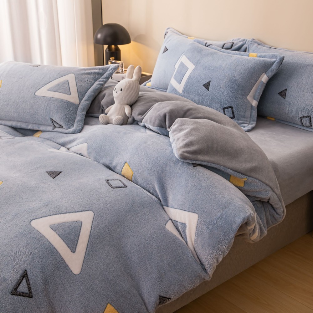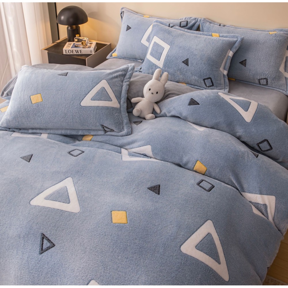 Lenjerie pat dublu, Super Pufoasa COCOLINO,cu ELASTIC, 4 piese, Jojo Home, Bleu, forme geometrice, cod produs: JOK217