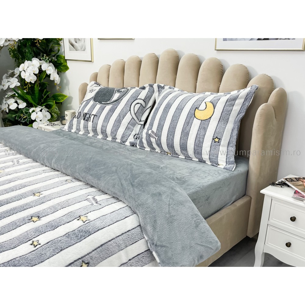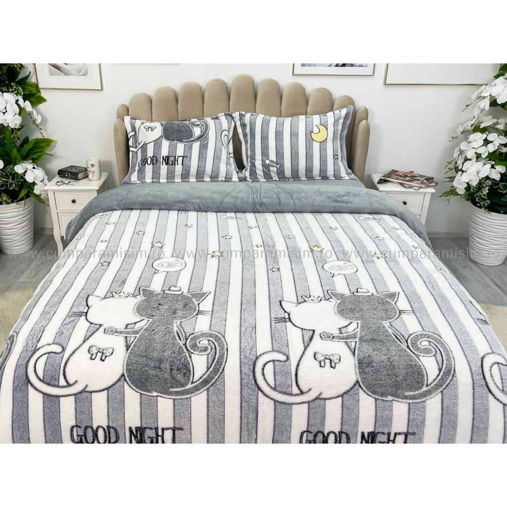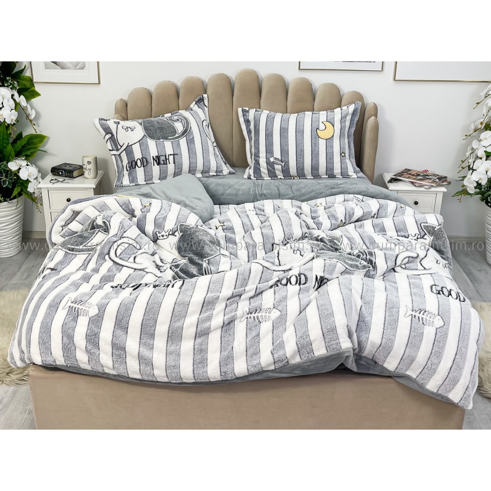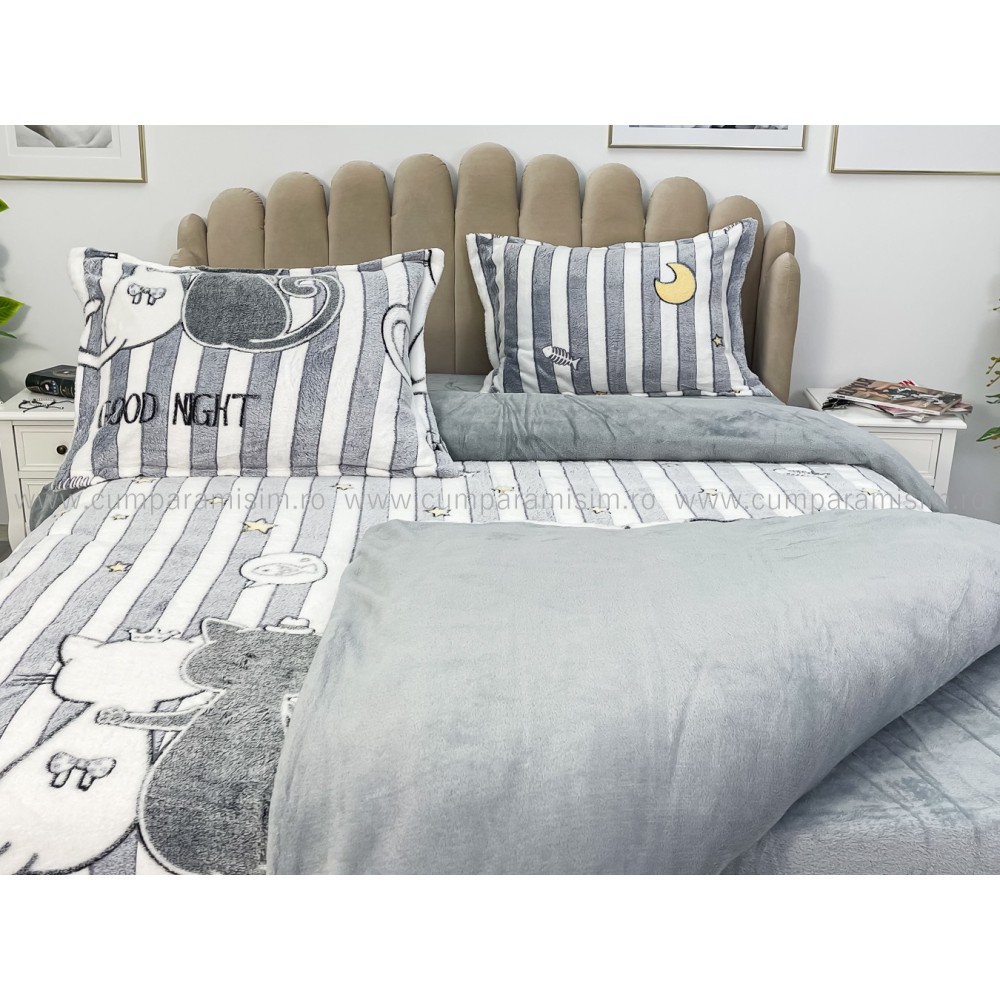 Lenjerie pat dublu, Super Pufoasa COCOLINO,cu ELASTIC, 4 piese, Jojo Home, Gri-Alb, dungi, pisicute, cod produs: JOK207