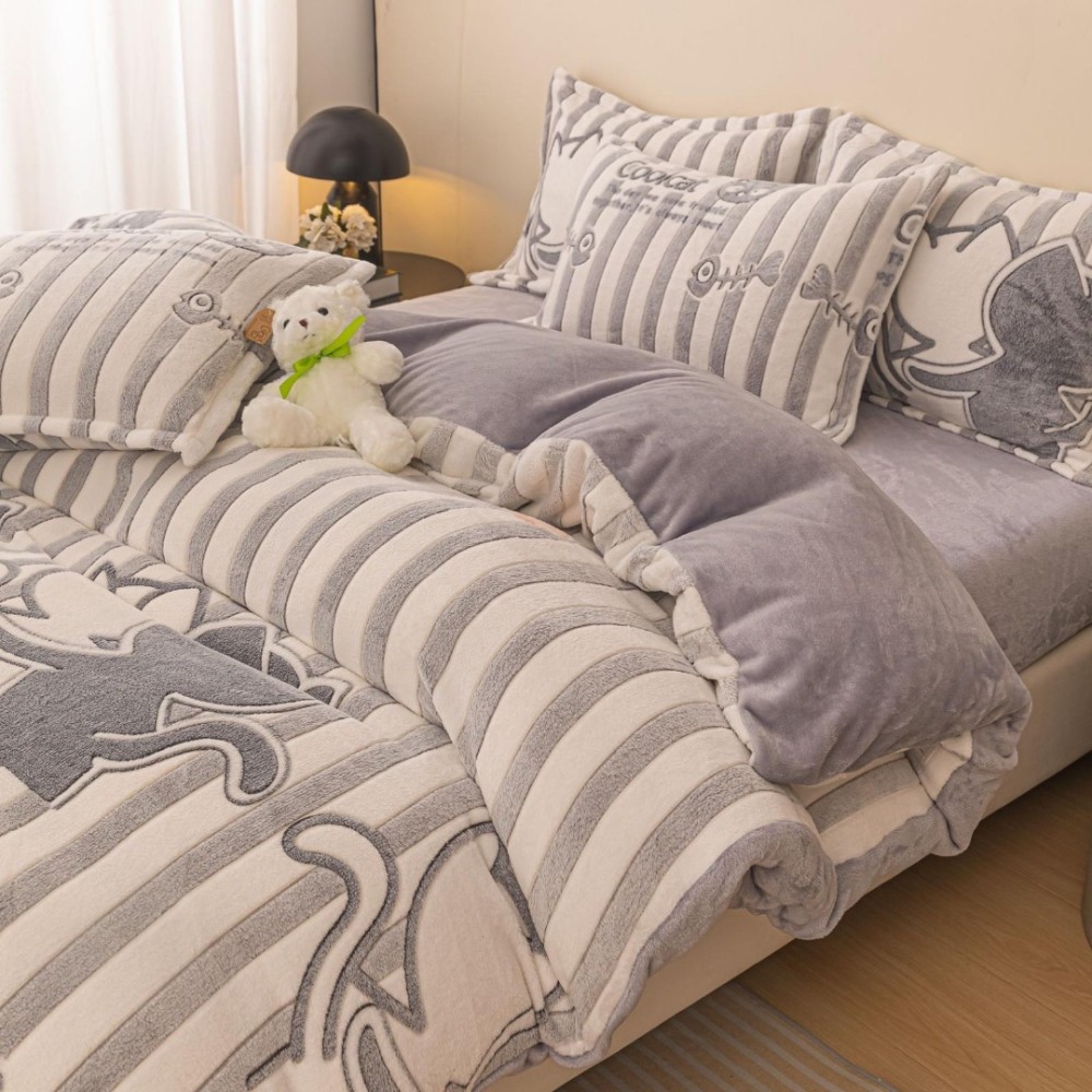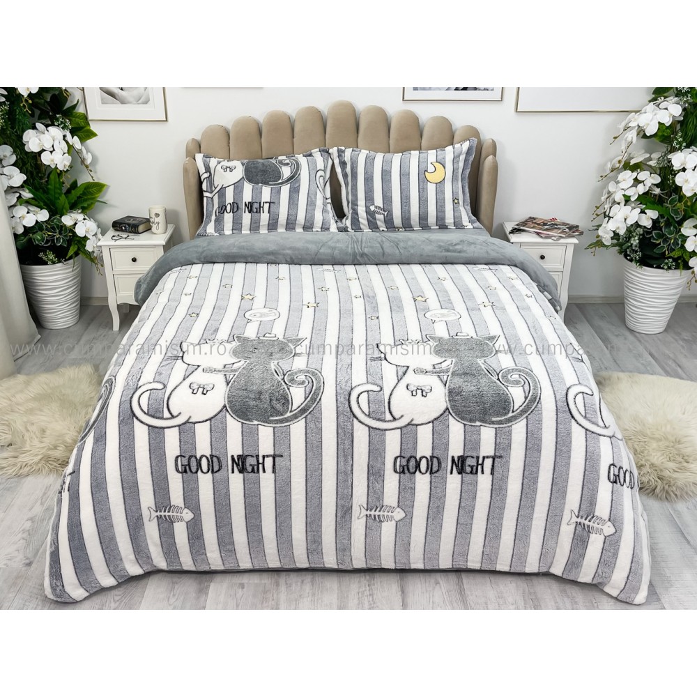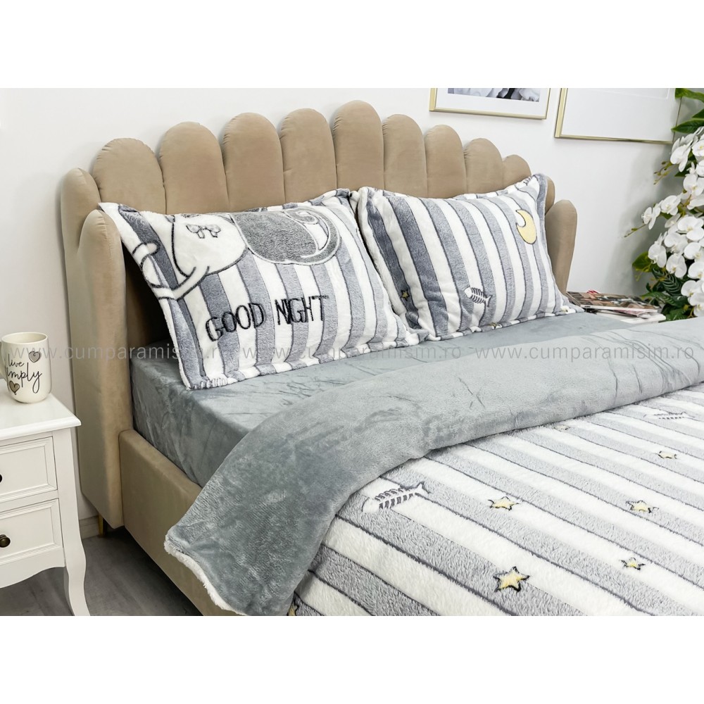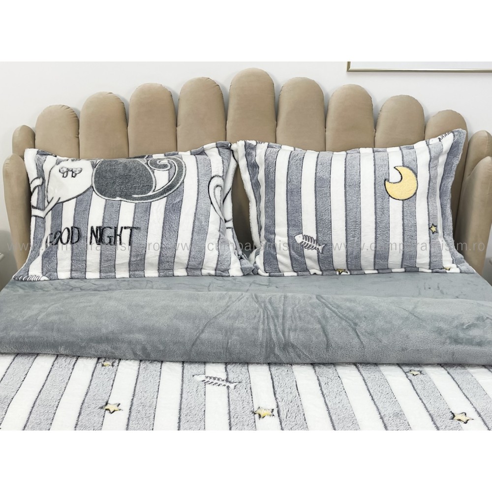 Lenjerie pat dublu, Super Pufoasa COCOLINO,cu ELASTIC, 4 piese, Jojo Home, Gri-Alb, dungi, pisicute, cod produs: JOK207