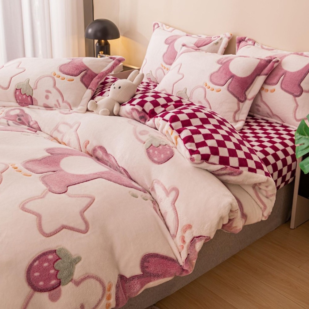 Lenjerie pat dublu, Super Pufoasa COCOLINO,cu ELASTIC, 4 piese, Jojo Home, Roz, ursuleti, capsune, stelute, cod produs: JOK220