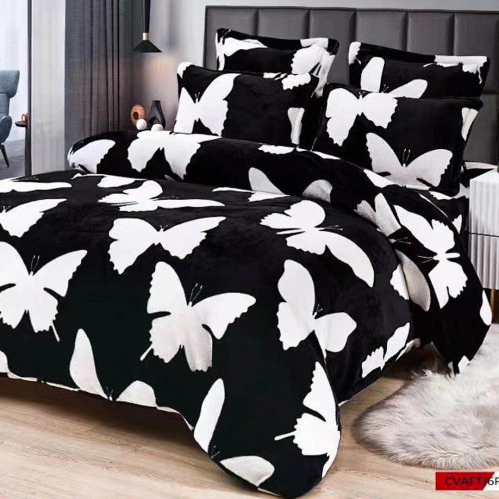Lenjerie pat dublu, Super Pufoasa COCOLINO,cu ELASTIC, 4 piese, Negru-Alb, fluturi, CumparaMisim, cod produs: YAF14