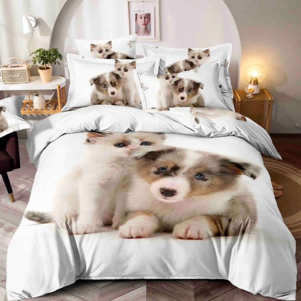 Lenjerie pat single, FINET, Imprimeu Digital - Identic cu poza, 4 piese, cu ELASTIC, Jojo Home, Alb, catel, pisicuta, cod produs: JOS30