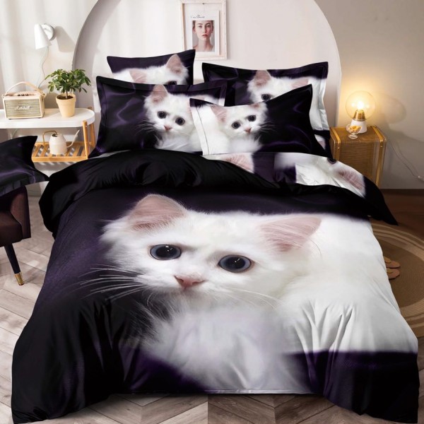Lenjerie pat single, FINET, Imprimeu Digital - Identic cu poza, 4 piese, cu ELASTIC, Jojo Home, Bleumarin-Alb, pisicuta, cod produs: JOS10