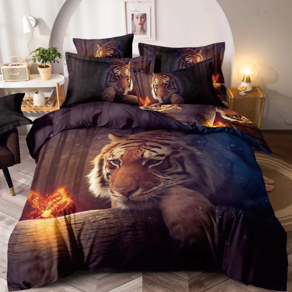 Lenjerie pat single, FINET, Imprimeu Digital - Identic cu poza, 4 piese, cu ELASTIC, Jojo Home, Bleumarin-Multicolor, tigru, cod produs: JOS2