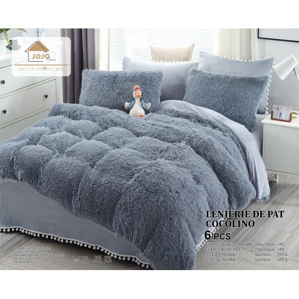 Lenjerie pufoasa COCOLINO cu 6 piese, pentru pat dublu. Produsul prezinta doua texturi de material cocolino, astfel incat cearsaful de pat, partea inferioara a cearsafului de pilota si partea inferioara a fetelor de perna sunt din microfibra plusata fina; cearsaful de pilota pe fata principala si fetele de perna sunt din cocolino(microfibra) super pufos, fluffy.