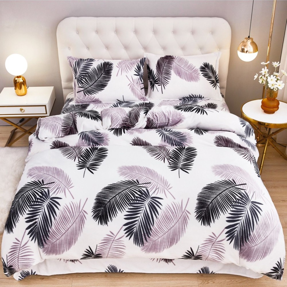 Lenjerie pentru Pat Dublu, Cocolino Premium, 4 Piese – Plușată, Groasă, și Călduroasă, Ideală pentru Iarnă – Confort Maxim, Antișifonare, Alb, Negru, frunze, CumparaMisim, cod produs: SDP-CC18