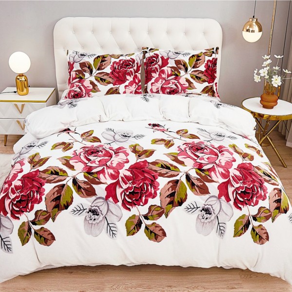 Lenjerie pentru Pat Dublu, Cocolino Premium, 4 Piese – Plușată, Groasă, și Călduroasă, Ideală pentru Iarnă – Confort Maxim, Antișifonare, Alb, Rosu, flori, CumparaMisim, cod produs: SDP-CC19