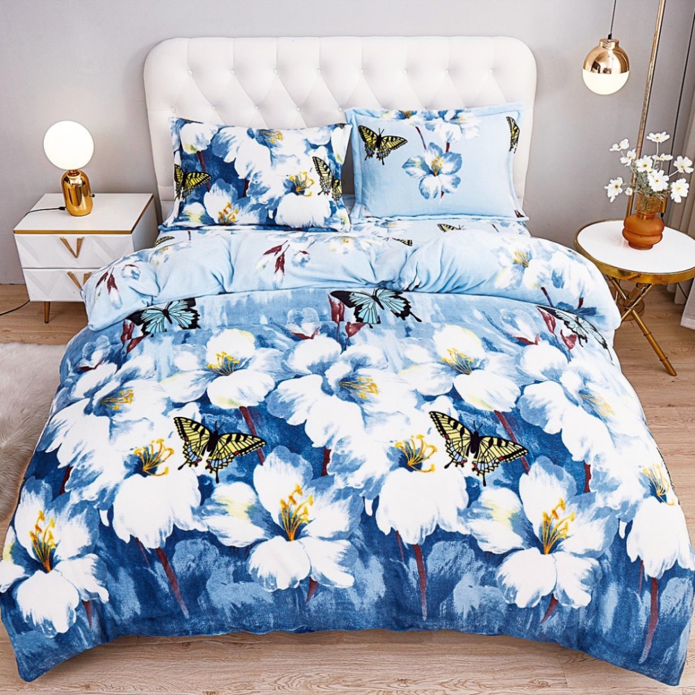 Lenjerie pentru Pat Dublu, Cocolino Premium, 4 Piese – Plușată, Groasă, și Călduroasă, Ideală pentru Iarnă – Confort Maxim, Antișifonare, Bleu, Alb, flori, CumparaMisim, cod produs: SDP-CC12