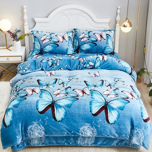 Lenjerie pentru Pat Dublu, Cocolino Premium, 4 Piese – Plușată, Groasă, și Călduroasă, Ideală pentru Iarnă – Confort Maxim, Antișifonare, Bleu, fluturi, CumparaMisim, cod produs: SDP-CC13