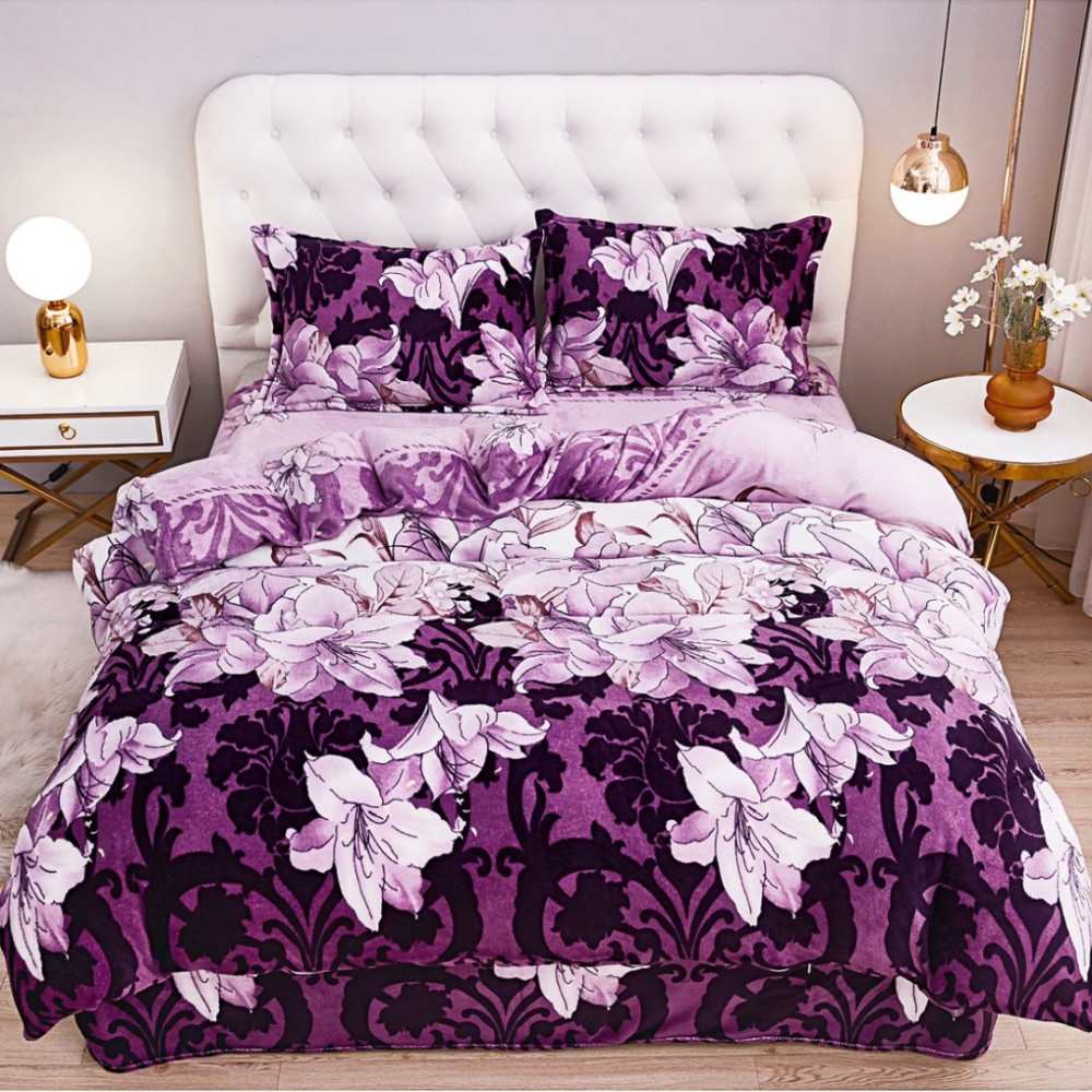Lenjerie pentru Pat Dublu, Cocolino Premium, 4 Piese – Plușată, Groasă, și Călduroasă, Ideală pentru Iarnă – Confort Maxim, Antișifonare, Mov, crini, CumparaMisim, cod produs: SDP-CC04
