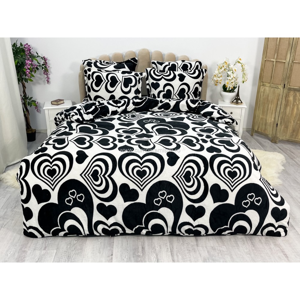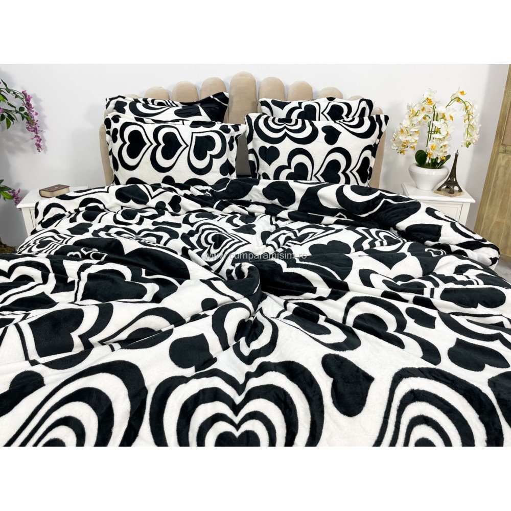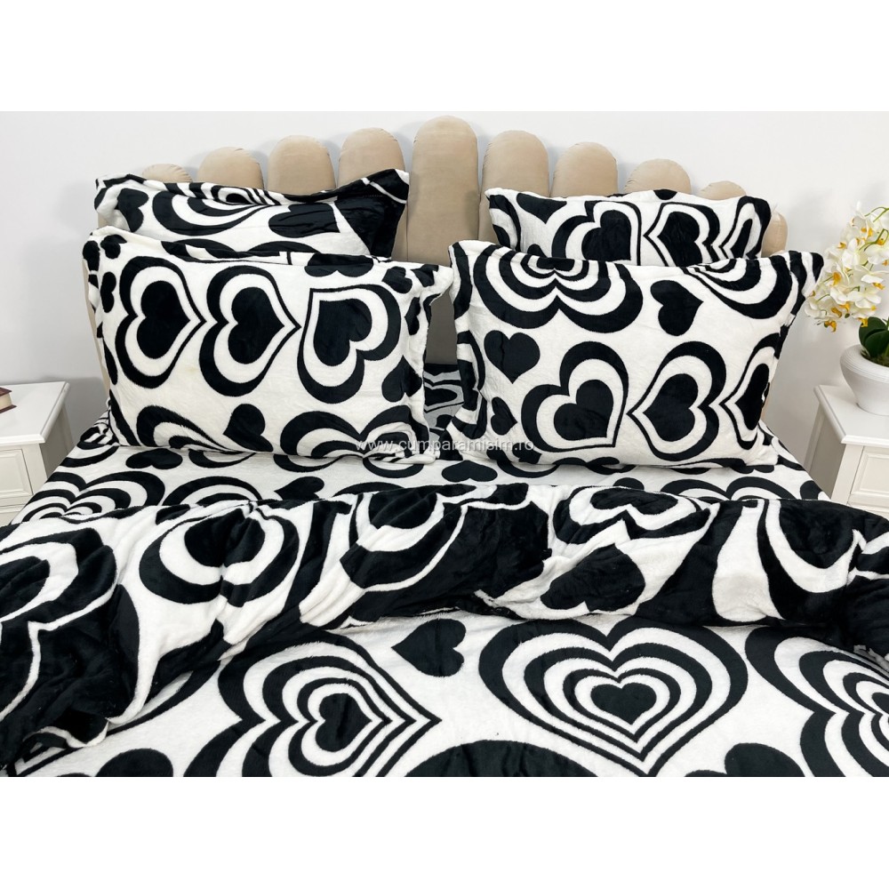 Lenjerie pat dublu, Super Pufoasa COCOLINO, 6 piese, Alb-Negru, inimioare, cod produs: CWW137