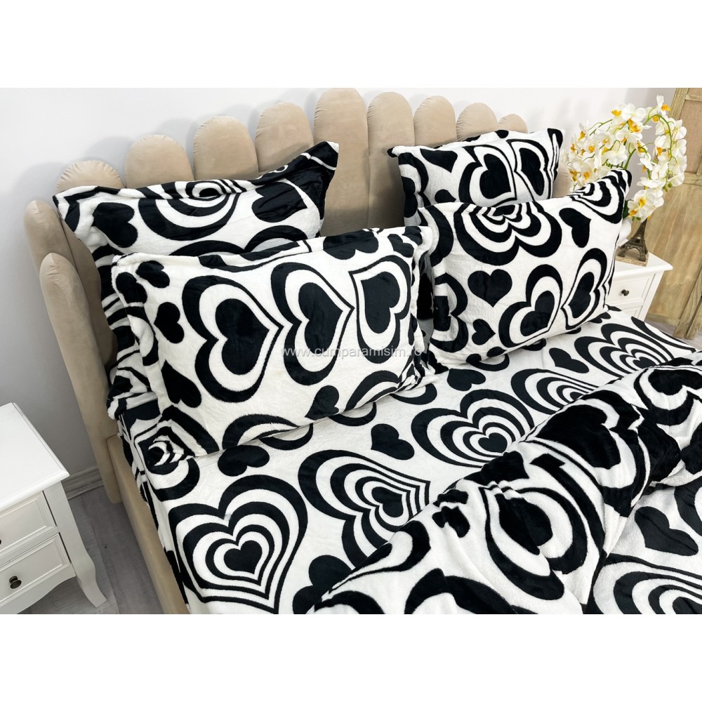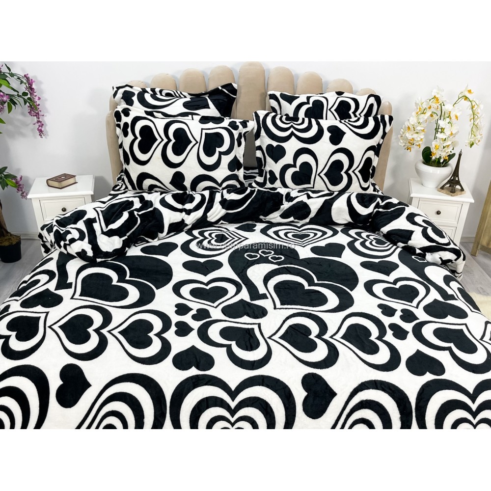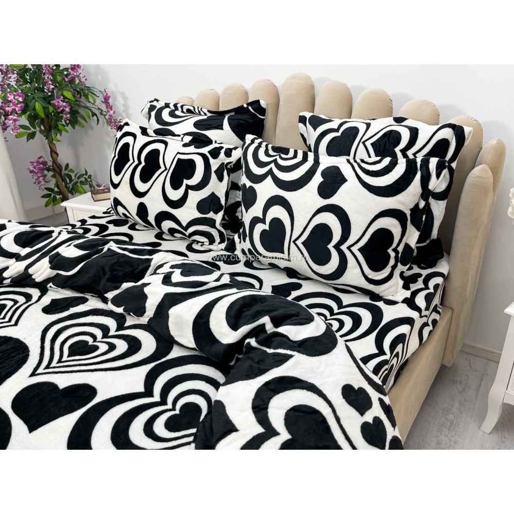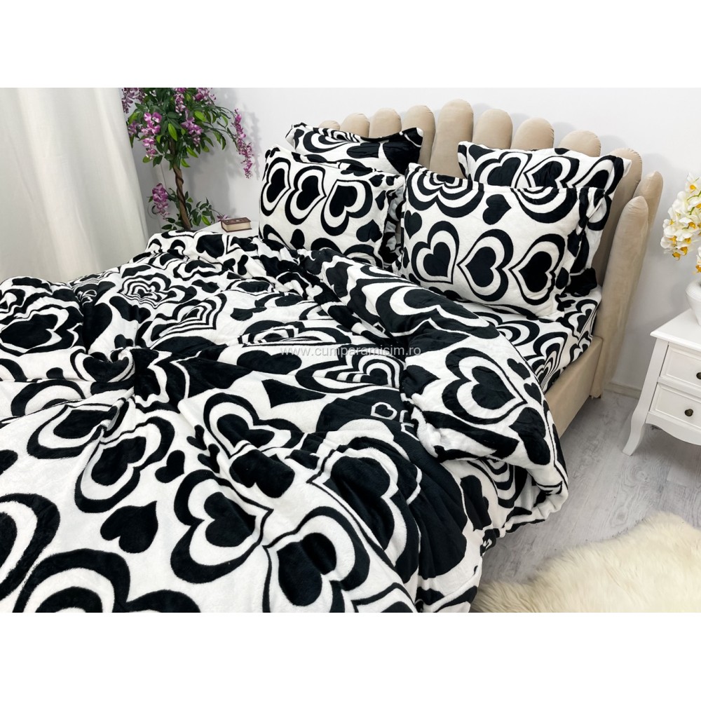 Lenjerie pat dublu, Super Pufoasa COCOLINO, 6 piese, Alb-Negru, inimioare, cod produs: CWW137