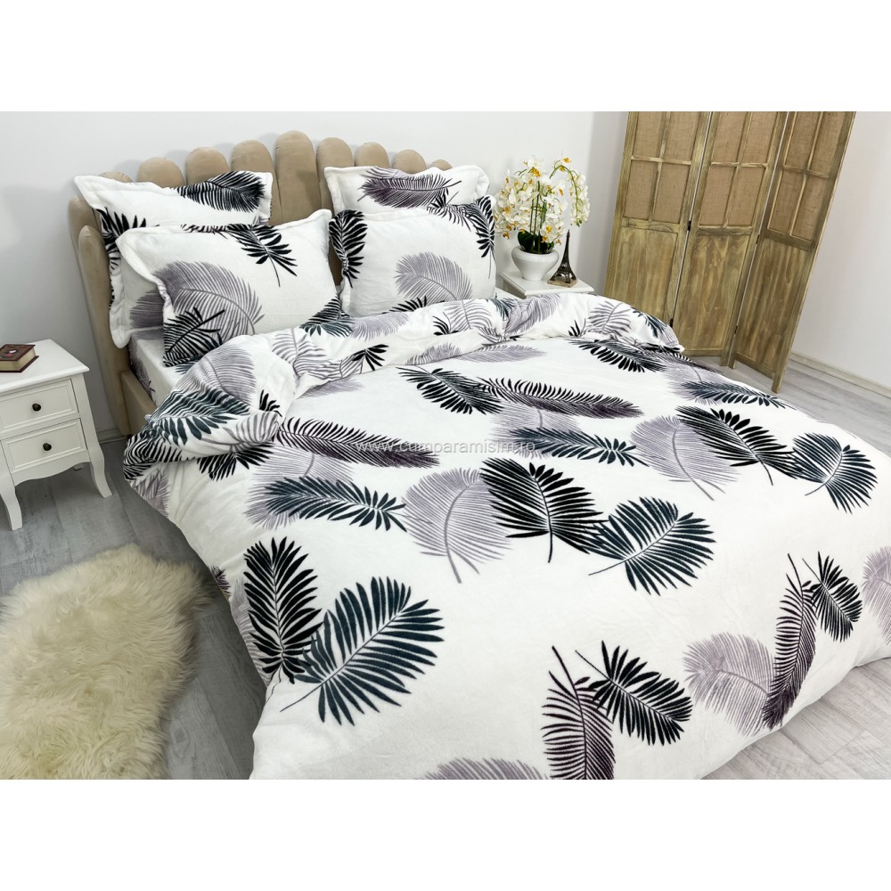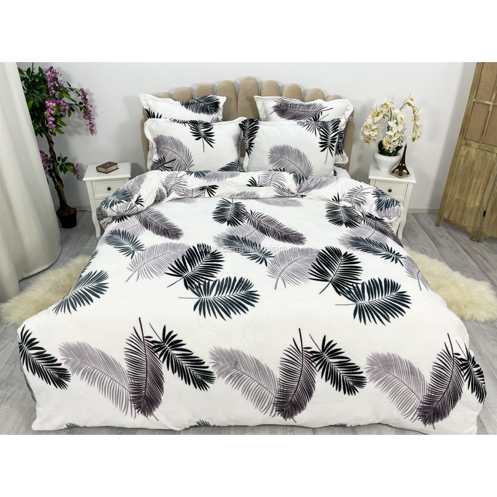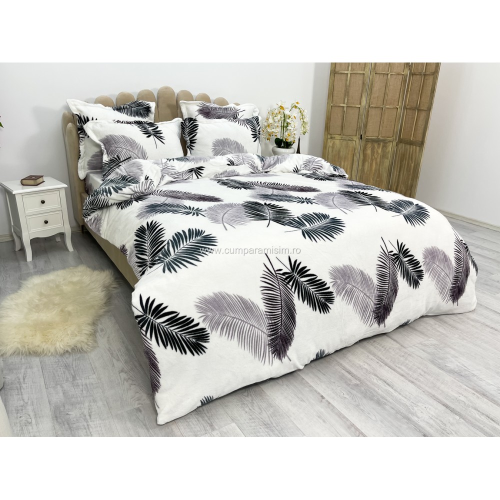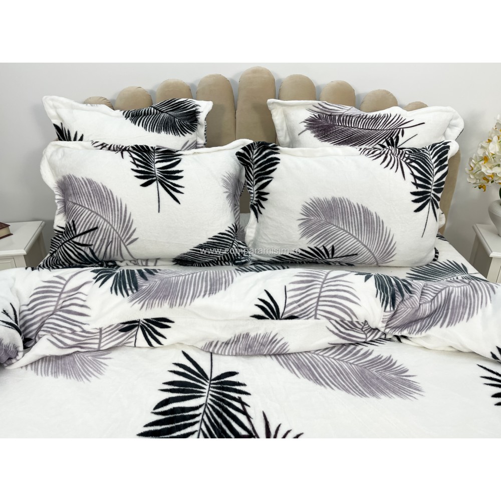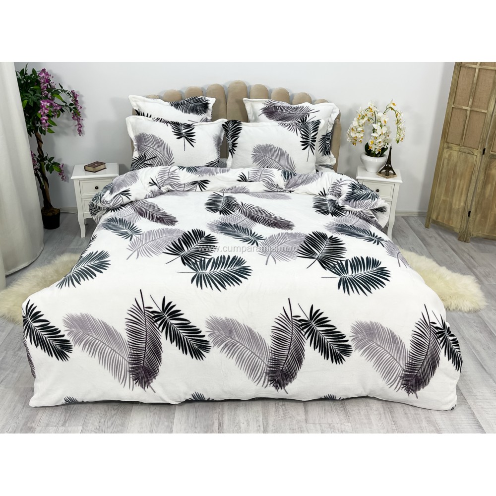 Lenjerie pat dublu, Super Pufoasa COCOLINO, 6 piese, Alb-Gri, frunze, cod produs: CWW15