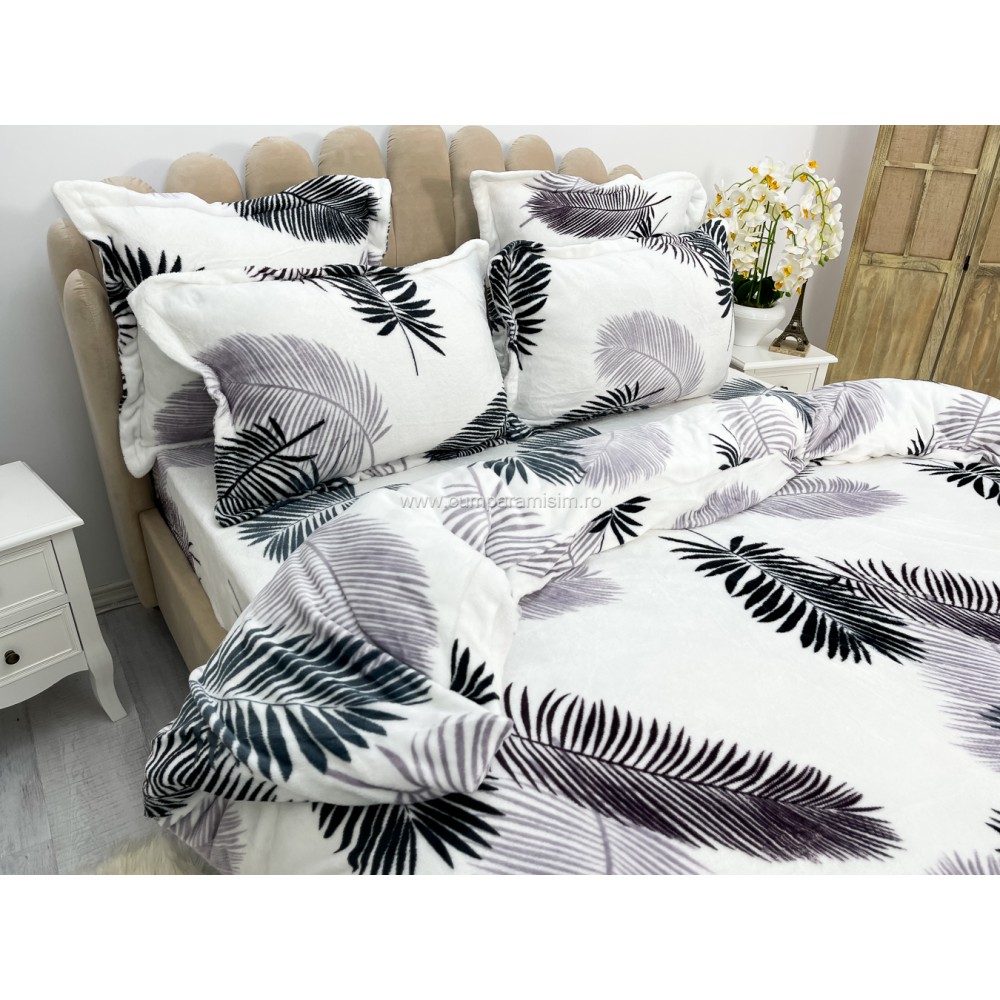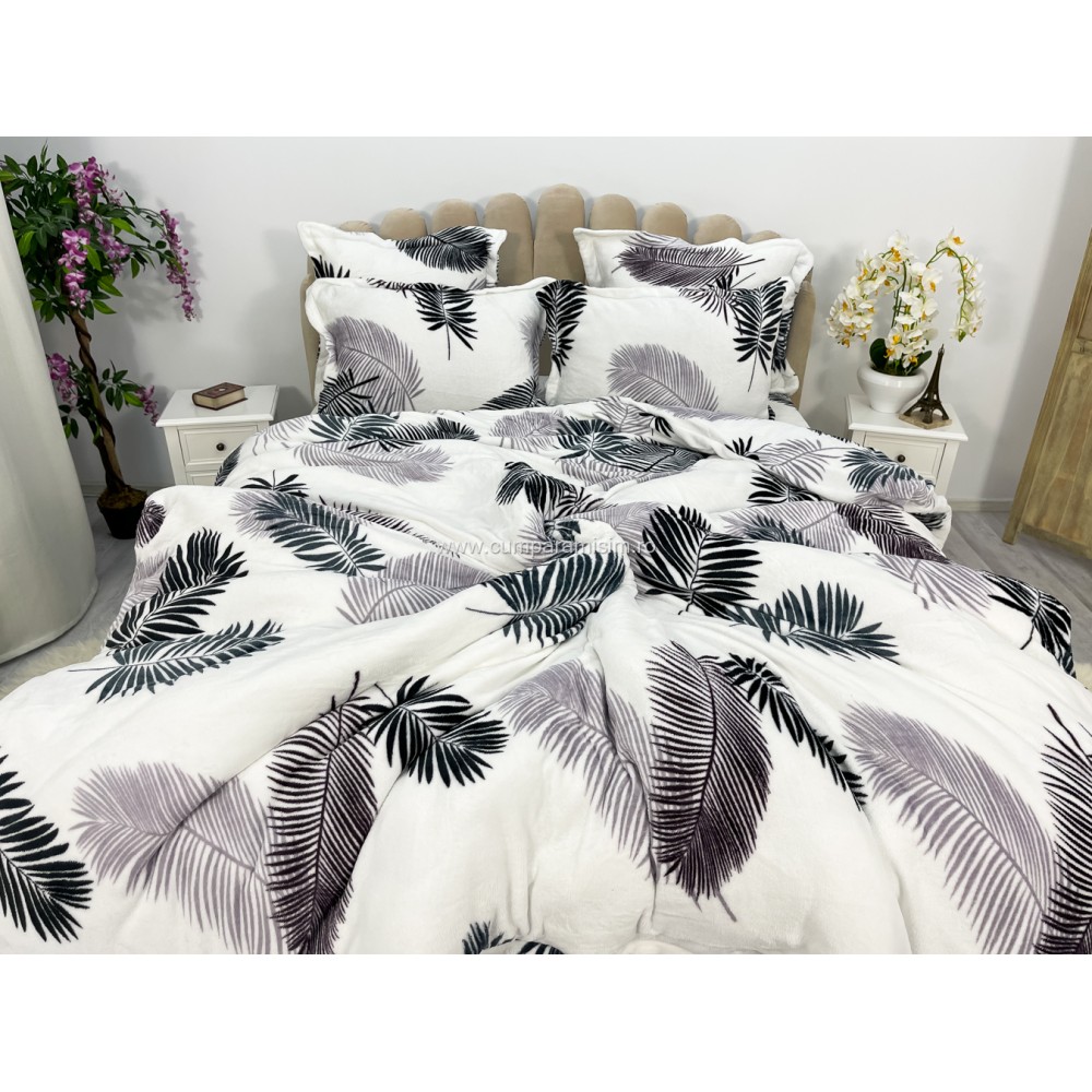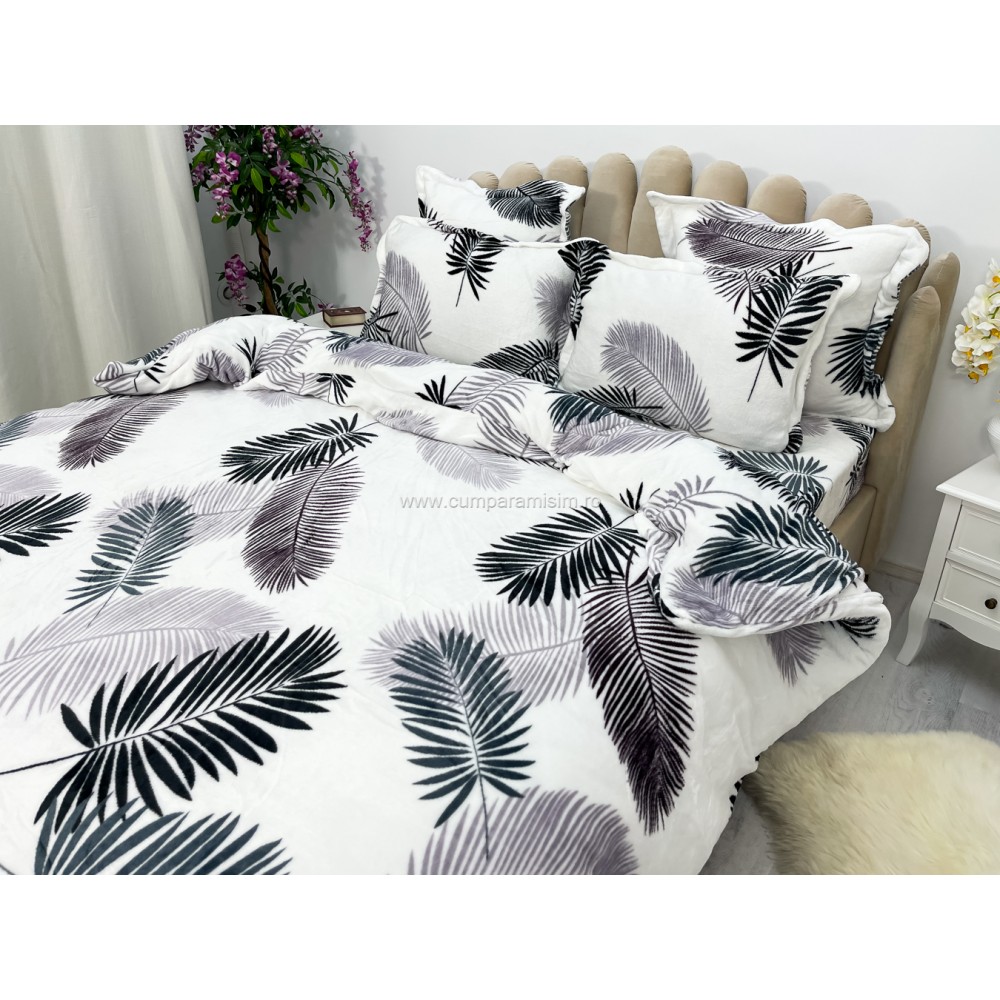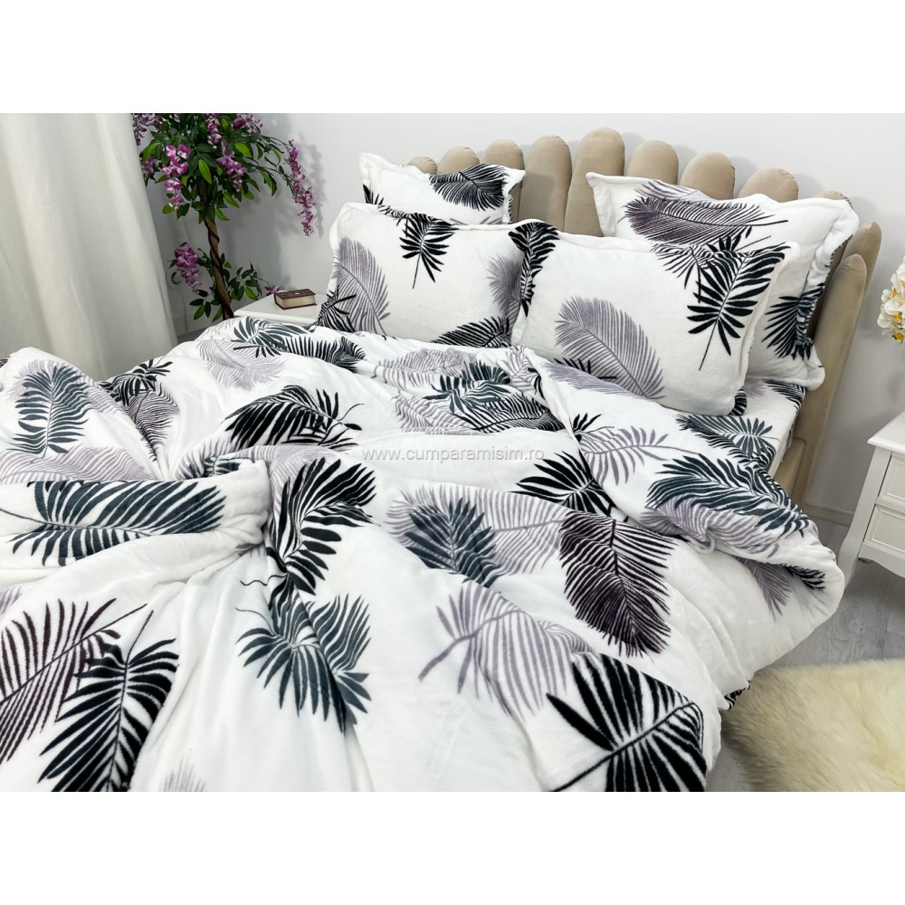 Lenjerie pat dublu, Super Pufoasa COCOLINO, 6 piese, Alb-Gri, frunze, cod produs: CWW15