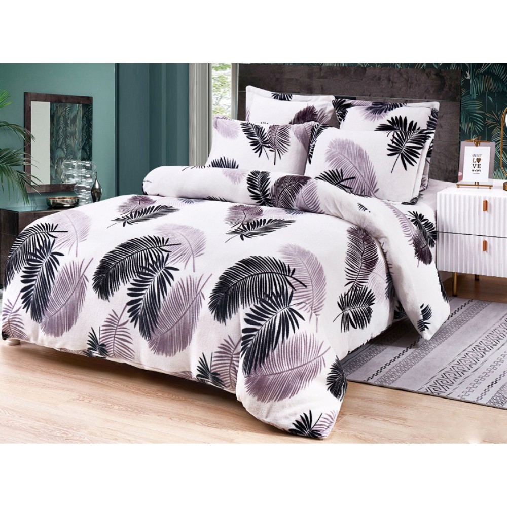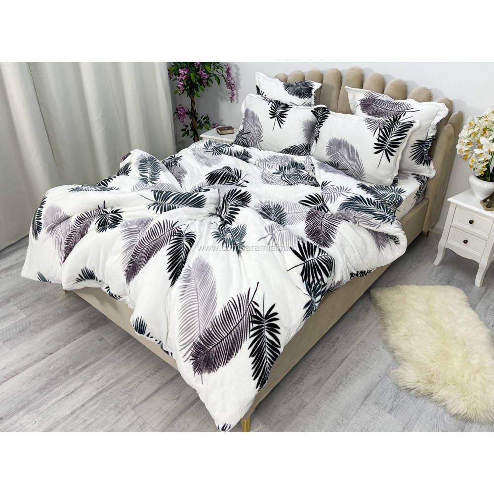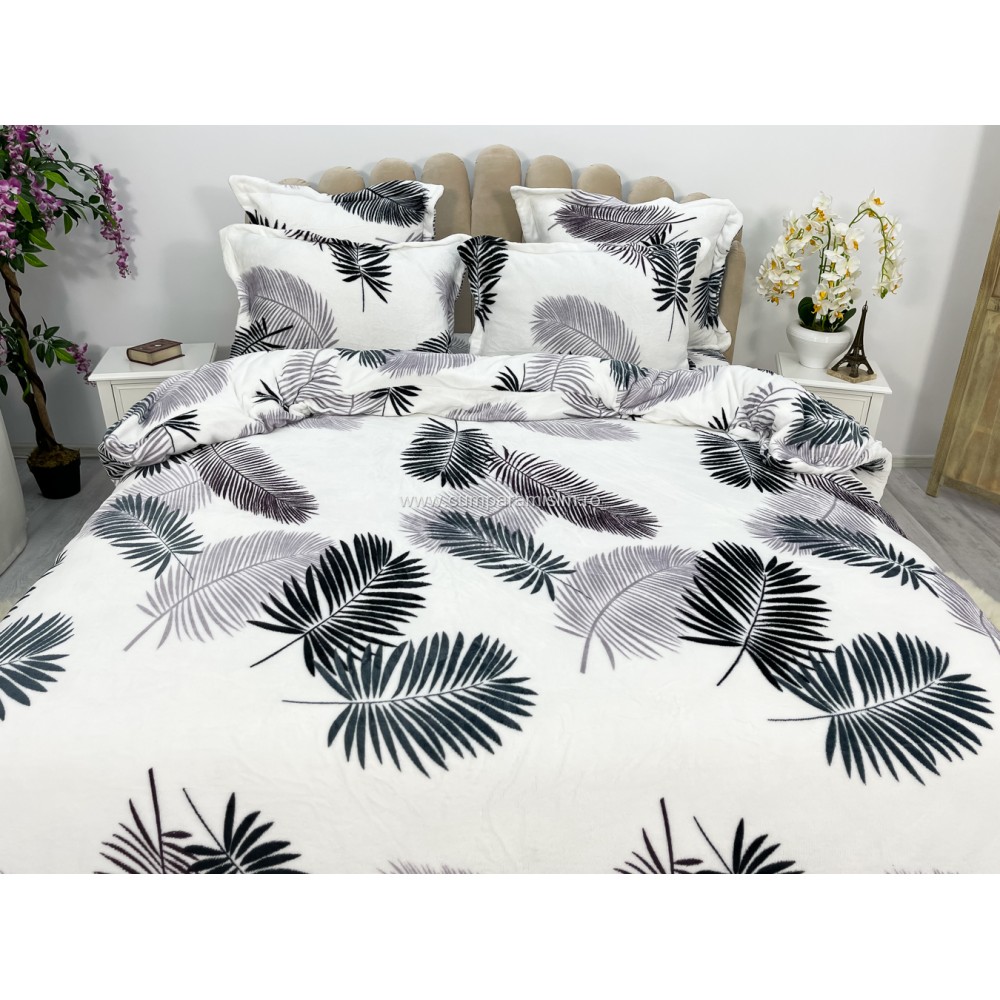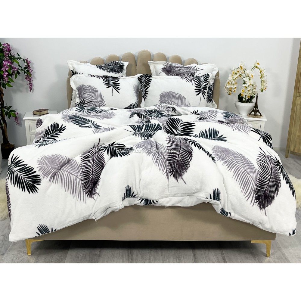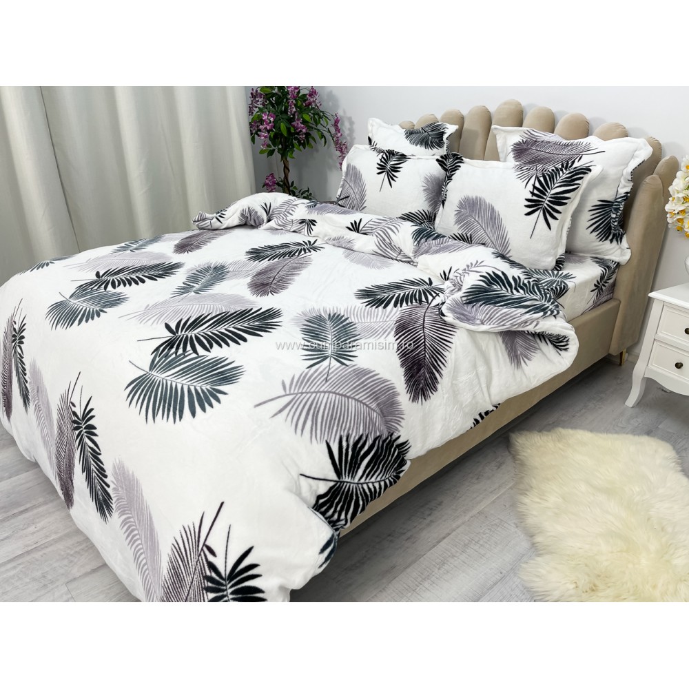 Lenjerie pat dublu, Super Pufoasa COCOLINO, 6 piese, Alb-Gri, frunze, cod produs: CWW15