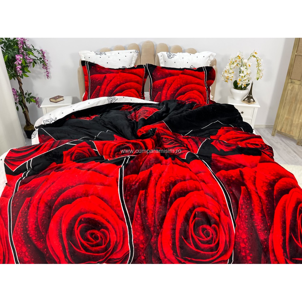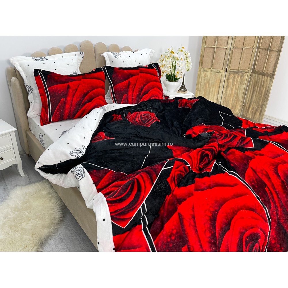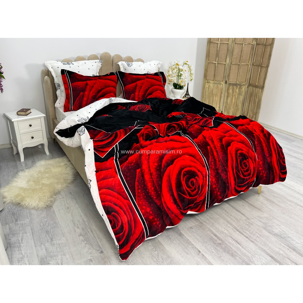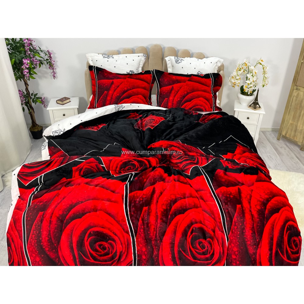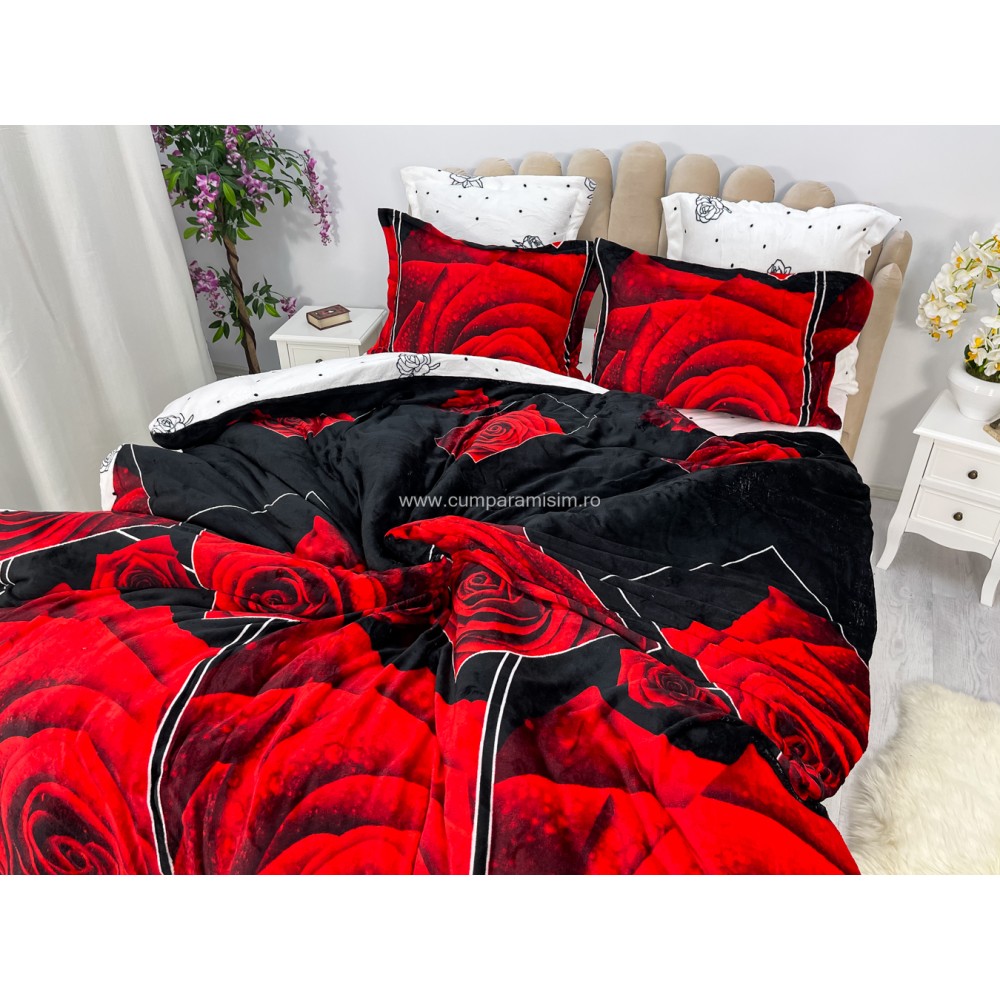 Lenjerie pat dublu, Super Pufoasa COCOLINO, 6 piese, Rosu-Alb-Negru, trandafiri, cod produs: CWW245