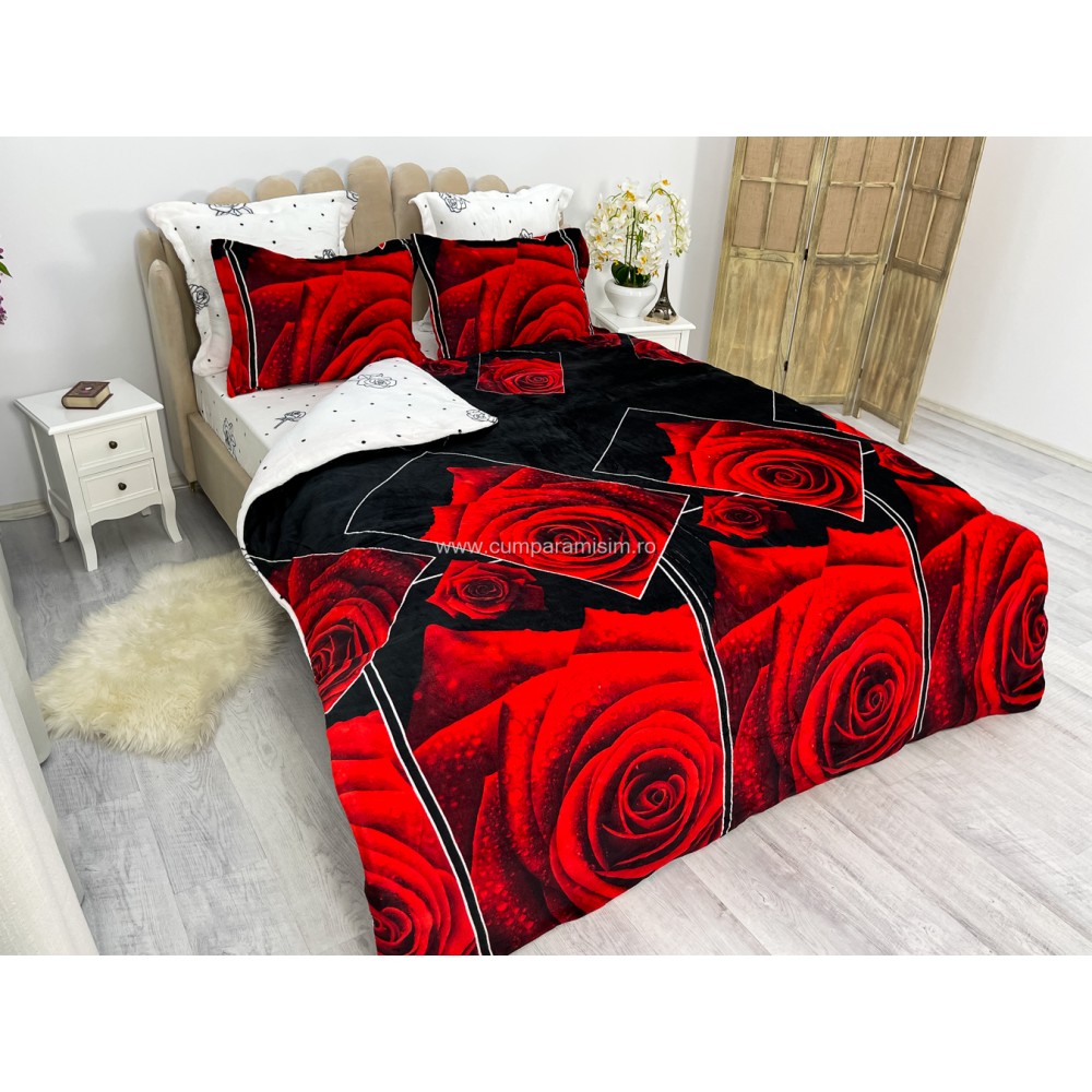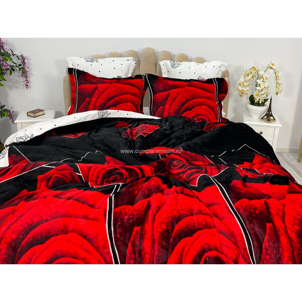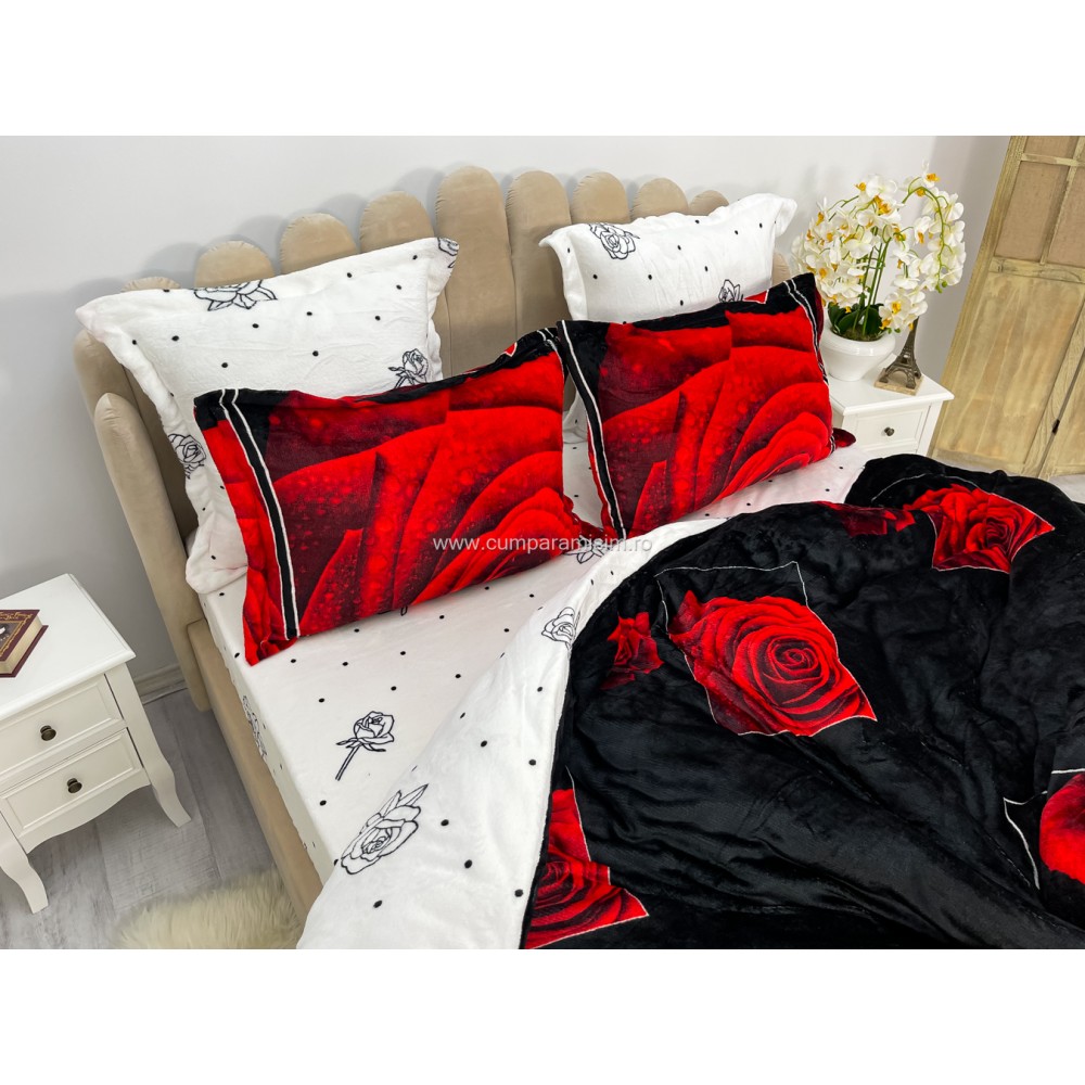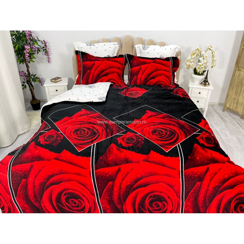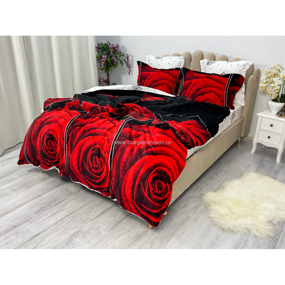 Lenjerie pat dublu, Super Pufoasa COCOLINO, 6 piese, Rosu-Alb-Negru, trandafiri, cod produs: CWW245