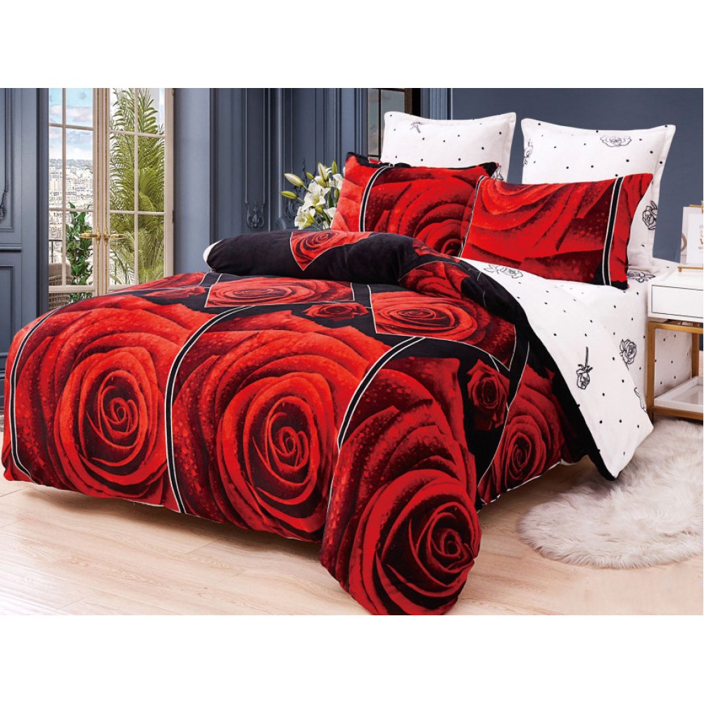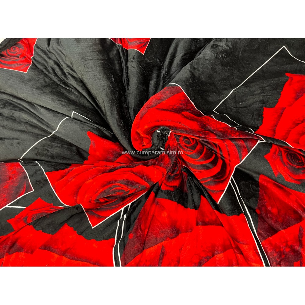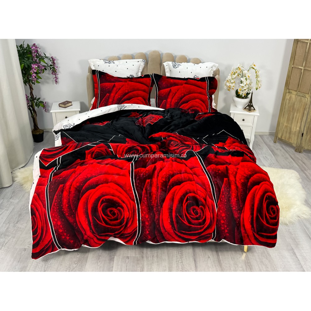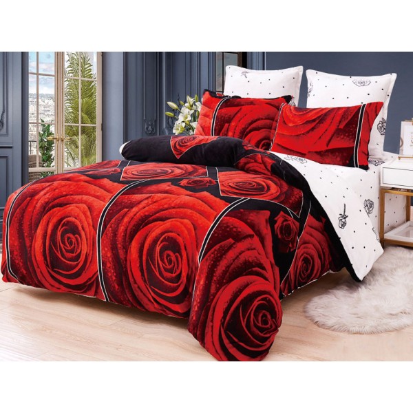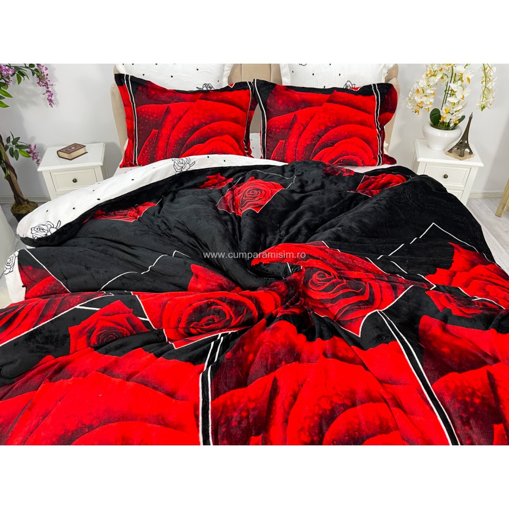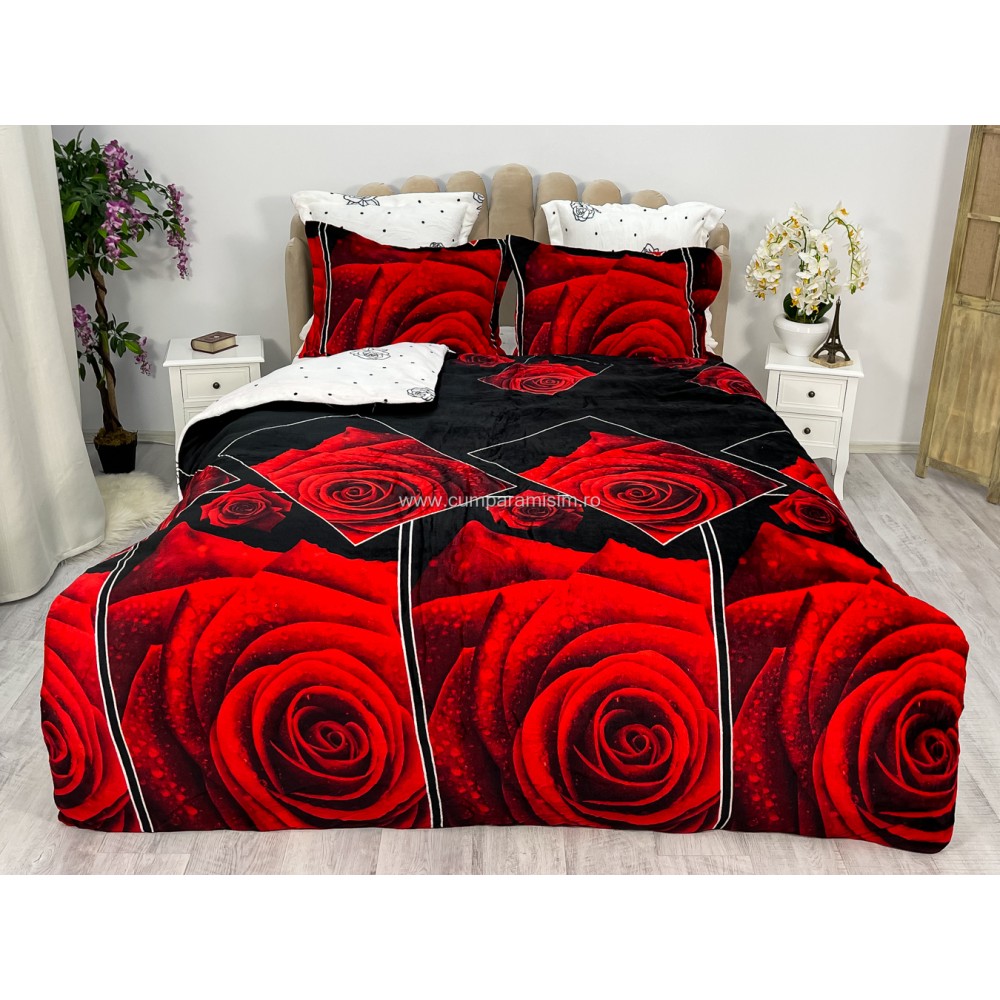 Lenjerie pat dublu, Super Pufoasa COCOLINO, 6 piese, Rosu-Alb-Negru, trandafiri, cod produs: CWW245
