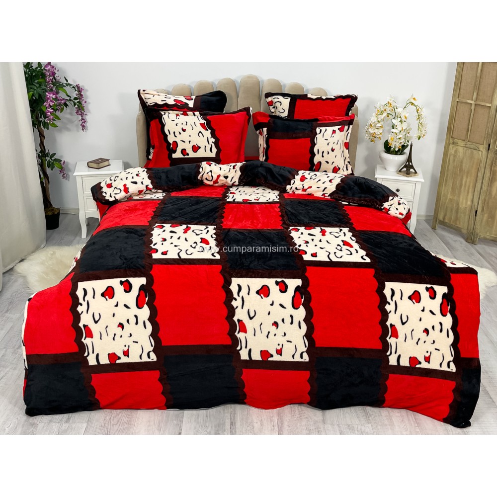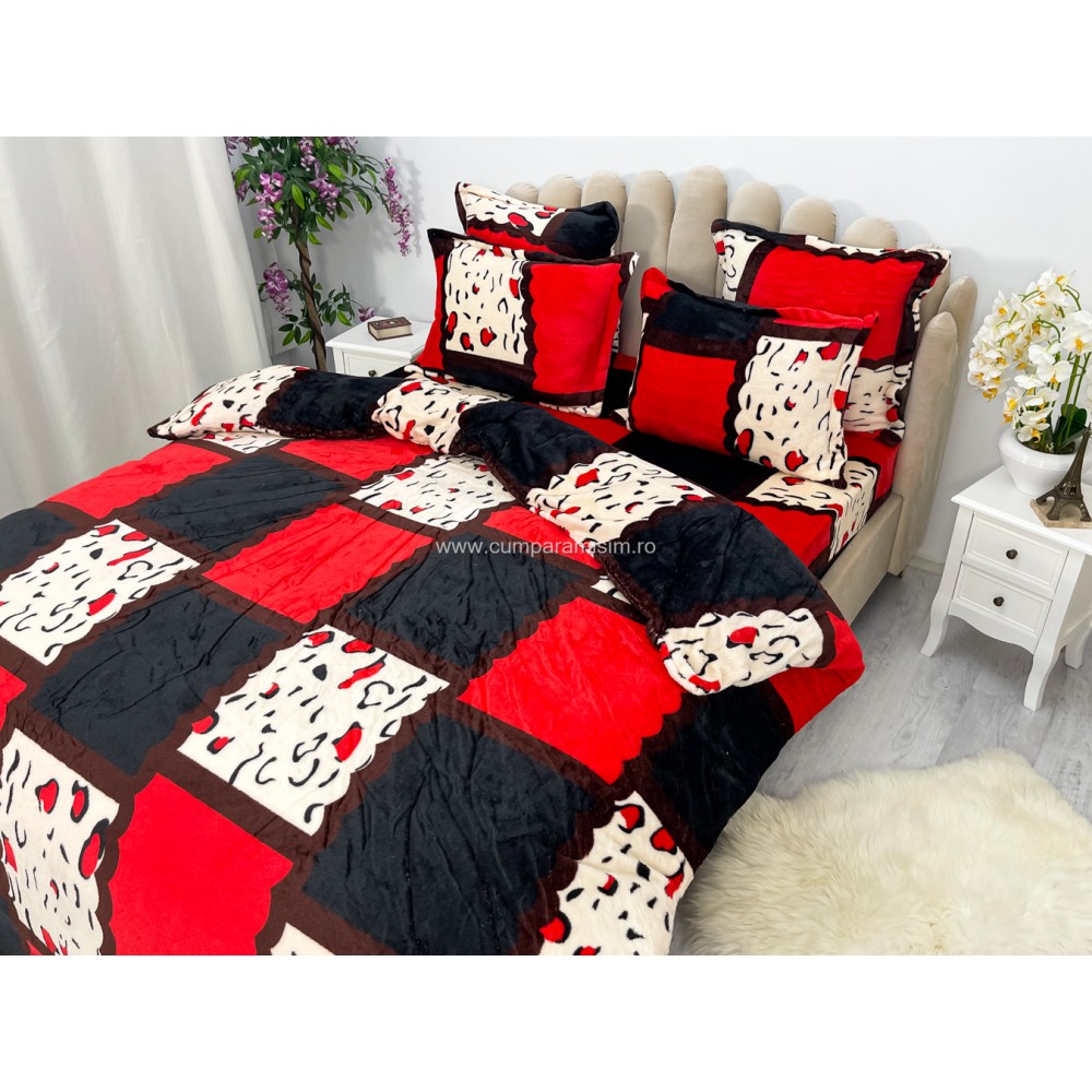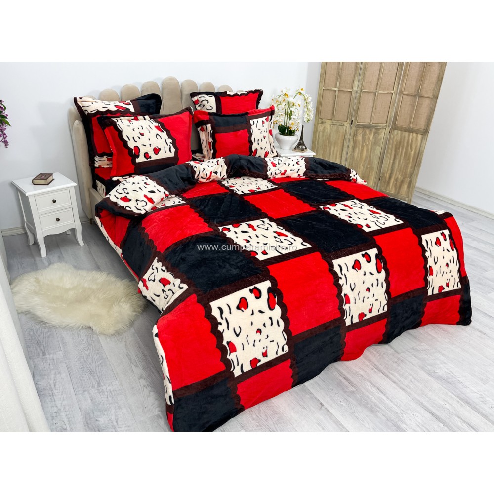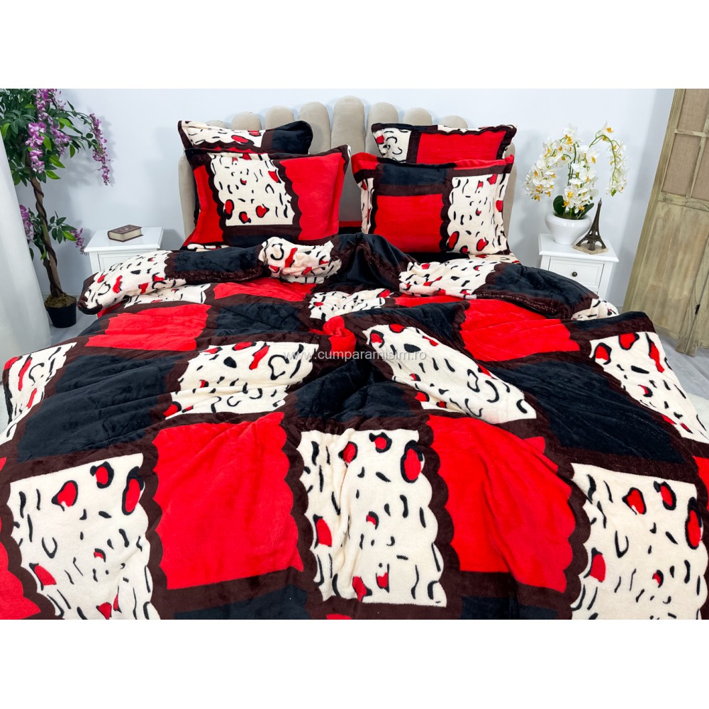 Lenjerie pat dublu, Super Pufoasa COCOLINO, 6 piese, Rosu-Alb-Negru, forme geometrice, cod produs: CWW53