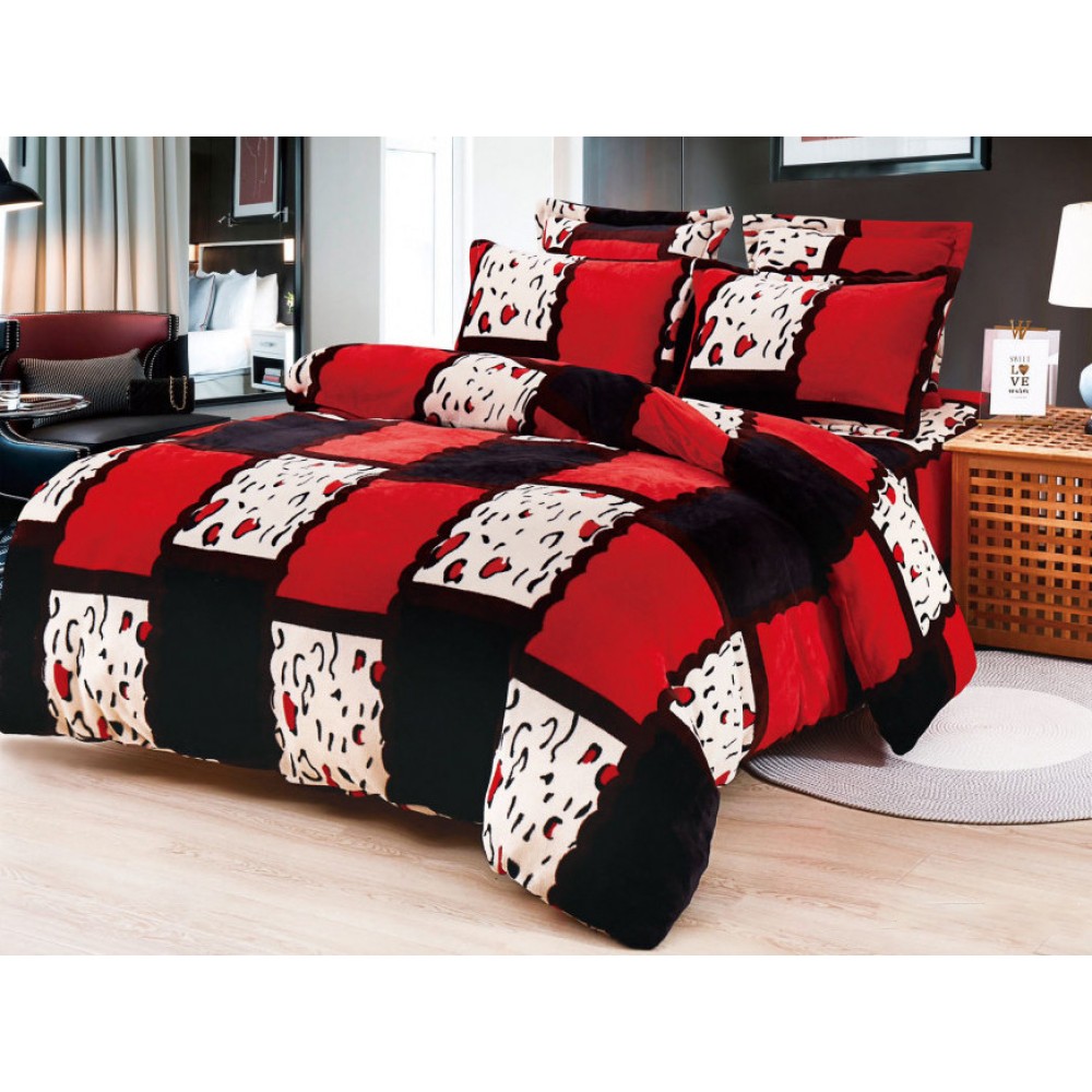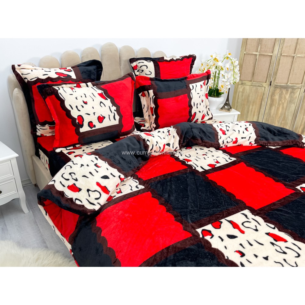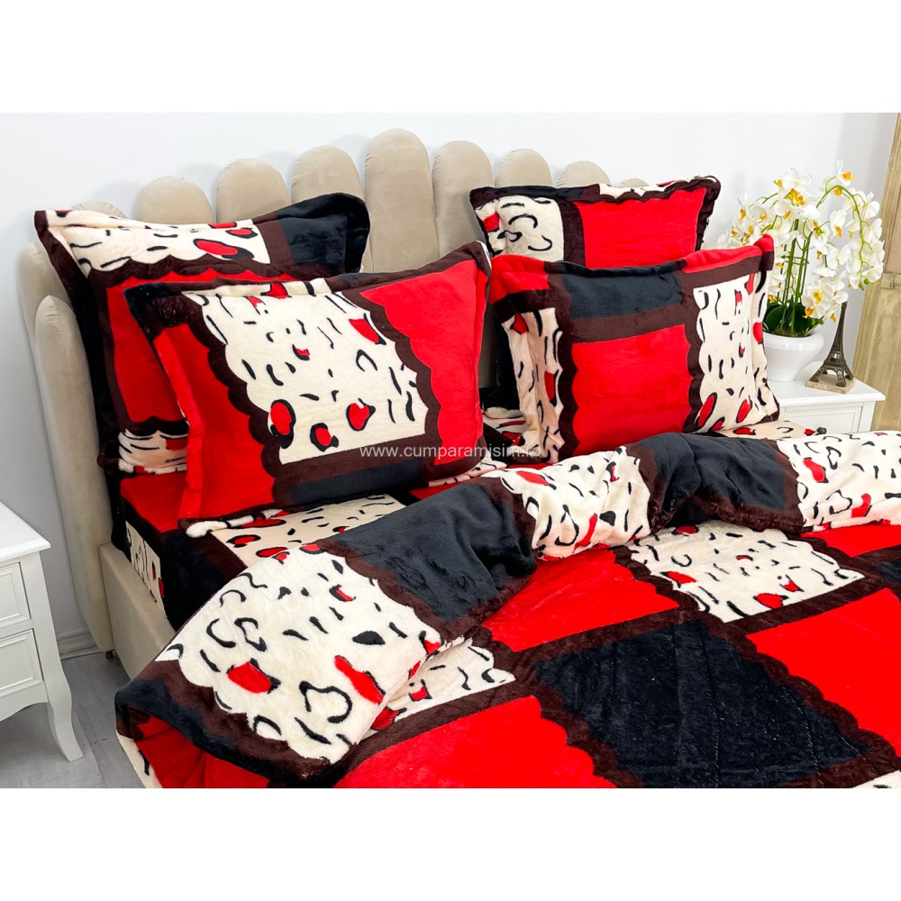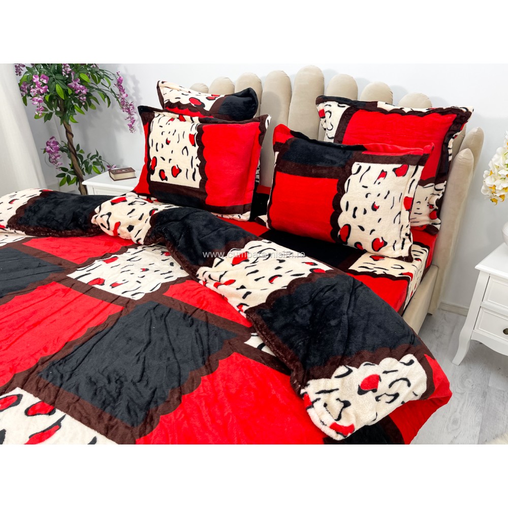 Lenjerie pat dublu, Super Pufoasa COCOLINO, 6 piese, Rosu-Alb-Negru, forme geometrice, cod produs: CWW53