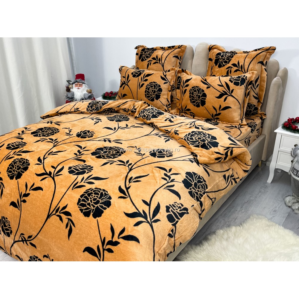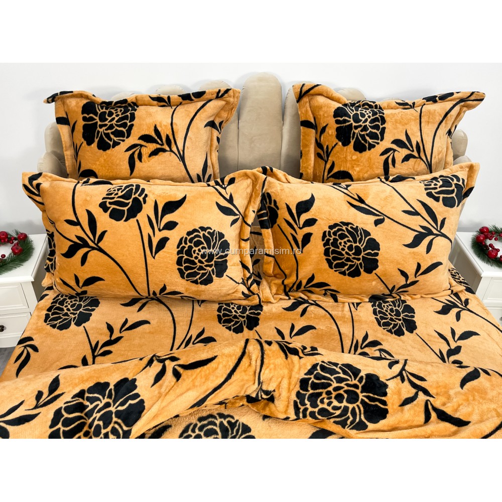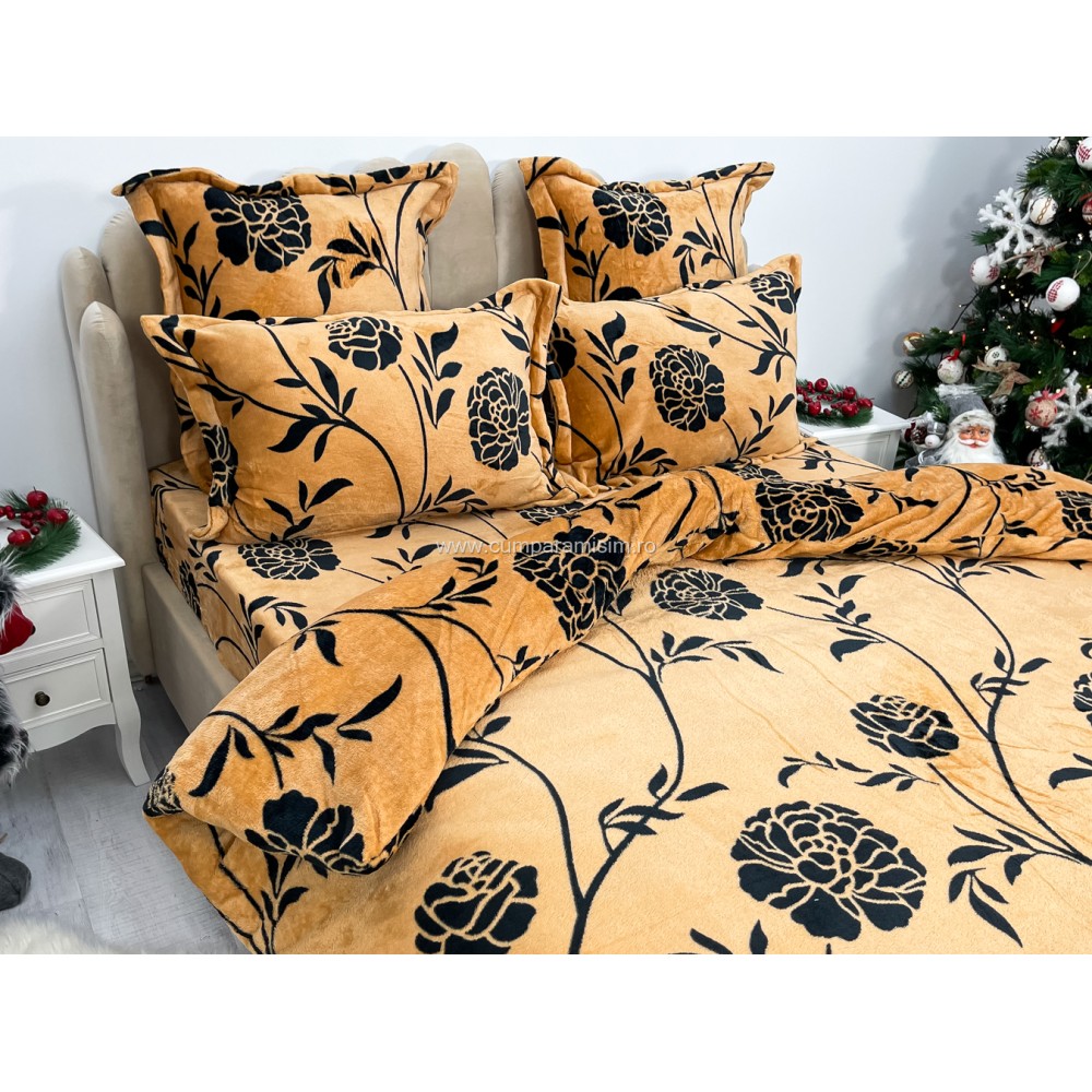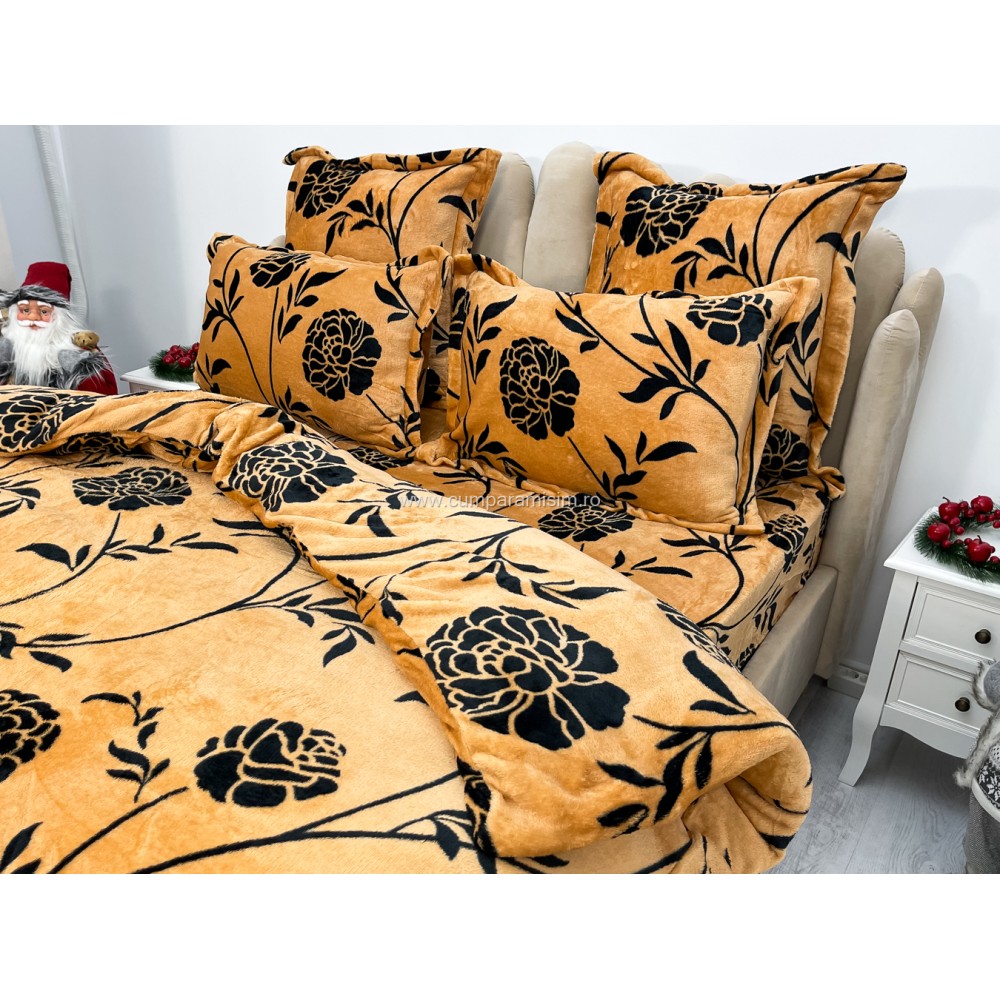 Lenjerie pat dublu, Super Pufoasa COCOLINO, 6 piese, Mustar-Negru, flori, cod produs: CWW55