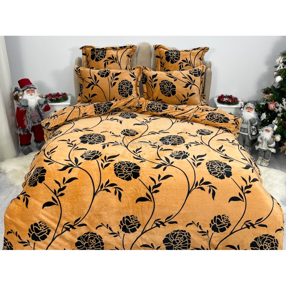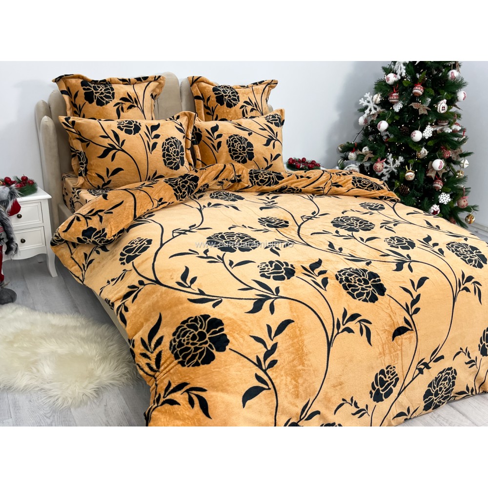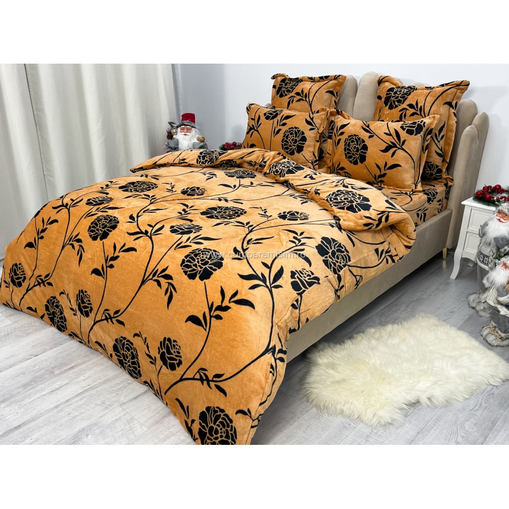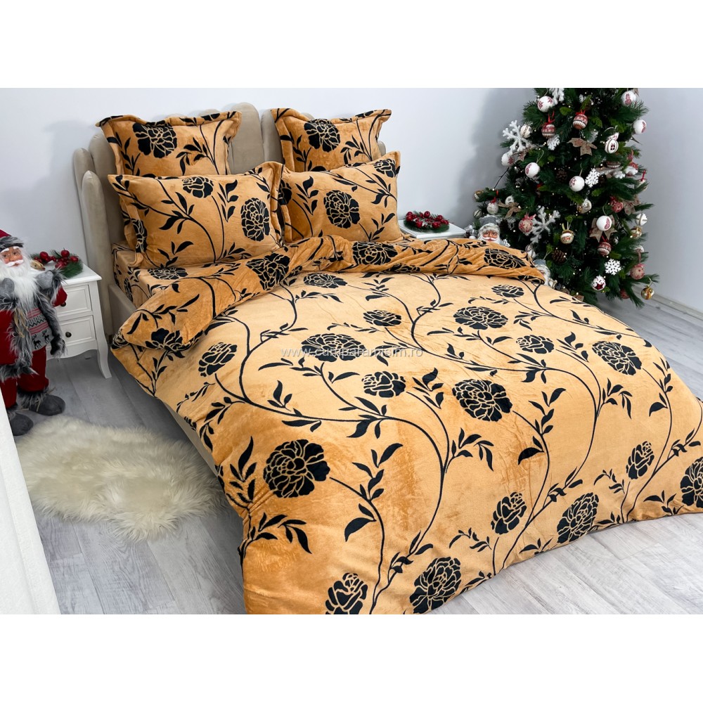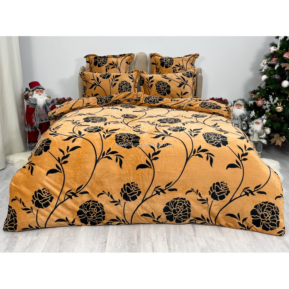 Lenjerie pat dublu, Super Pufoasa COCOLINO, 6 piese, Mustar-Negru, flori, cod produs: CWW55