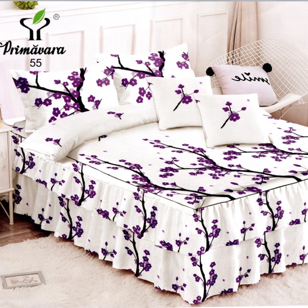 Lenjerie Premium Pat Dublu FINET, 6 Piese – Volănașe Sofisticate, Fixare Perfectă cu Elastic, Alb, Mov, Flori, Primavara Casa, cod produs: PRM-K55
