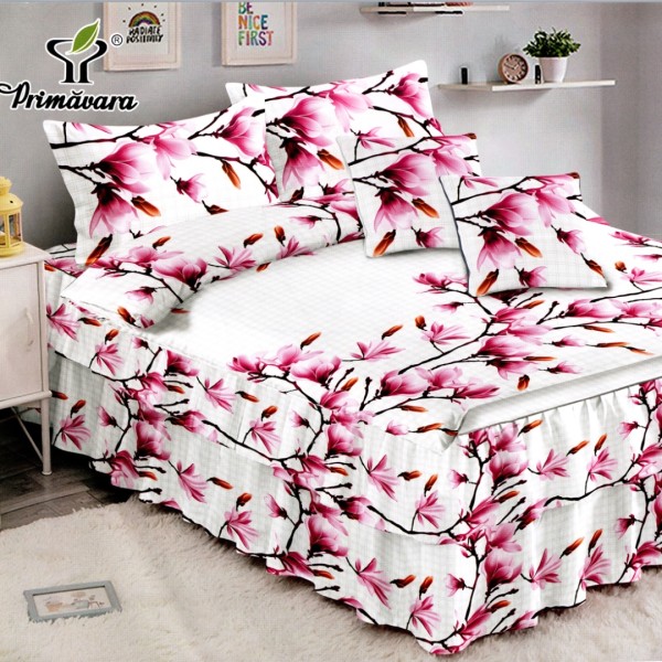 Lenjerie Premium Pat Dublu FINET, 6 Piese – Volănașe Sofisticate, Fixare Perfectă cu Elastic, Alb, Roz, Magnolii, Primavara Casa, cod produs: PRM-K192