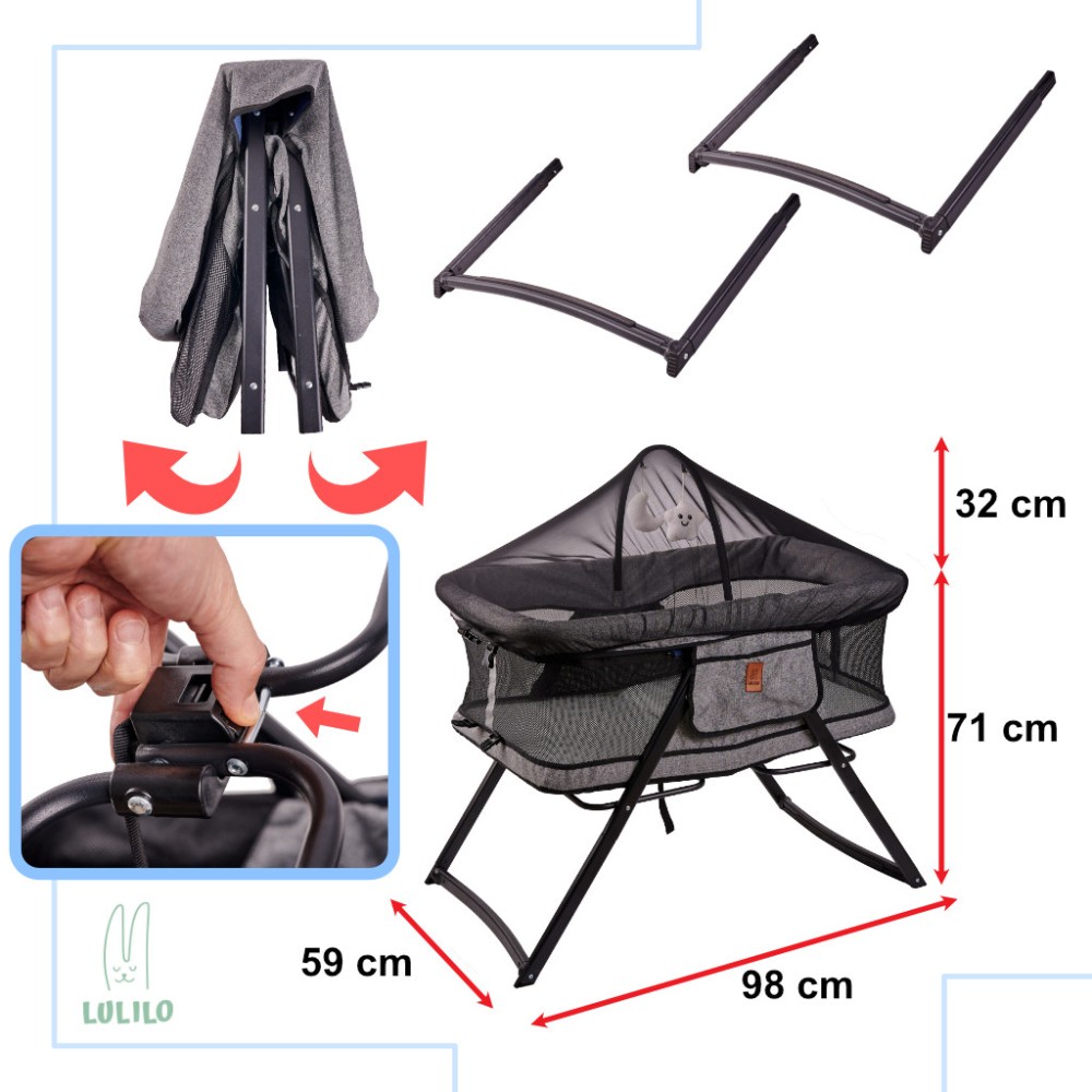 Culorile neutre ale leagănului se potrivesc cu orice cameră, iar capacitatea de a se plia și desfășura rapid îi permite să fie amplasat oriunde. Atunci când este pliat, leagănul nu ocupă mult spațiu și poate fi luat cu succes în vacanță sau în familie, astfel încât micuțul dumneavoastră să poată dormi întotdeauna în confortul propriului pat.