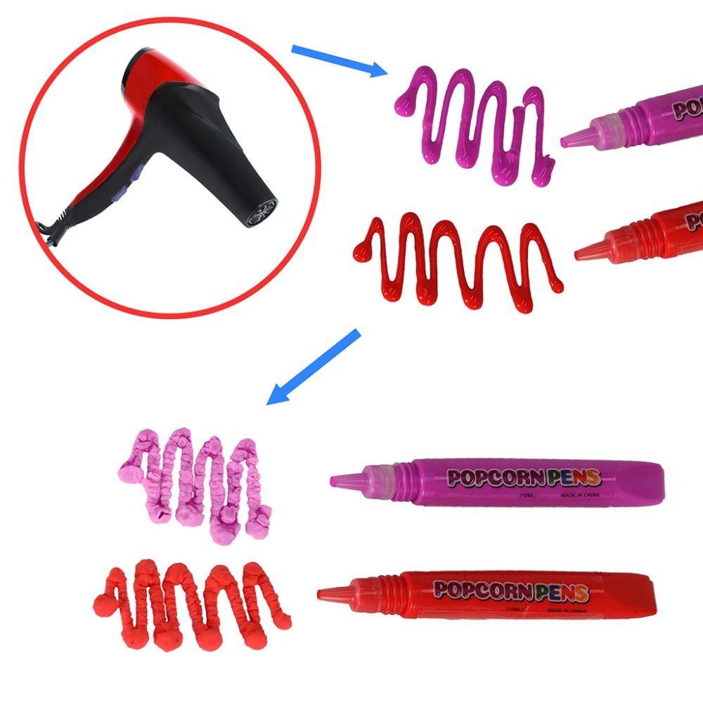 După ce ați terminat de desenat, luați un uscător de păr și direcționați aerul cald al uscătorului de păr asupra operei de artă pe care ați creat-o. După puțin timp, liniile colorate vor începe să se "umfle" și să crească în volum, ca un bob de porumb care se transformă în popcorn. Cu siguranță nu ați mai văzut niciodată un asemenea spectacol!