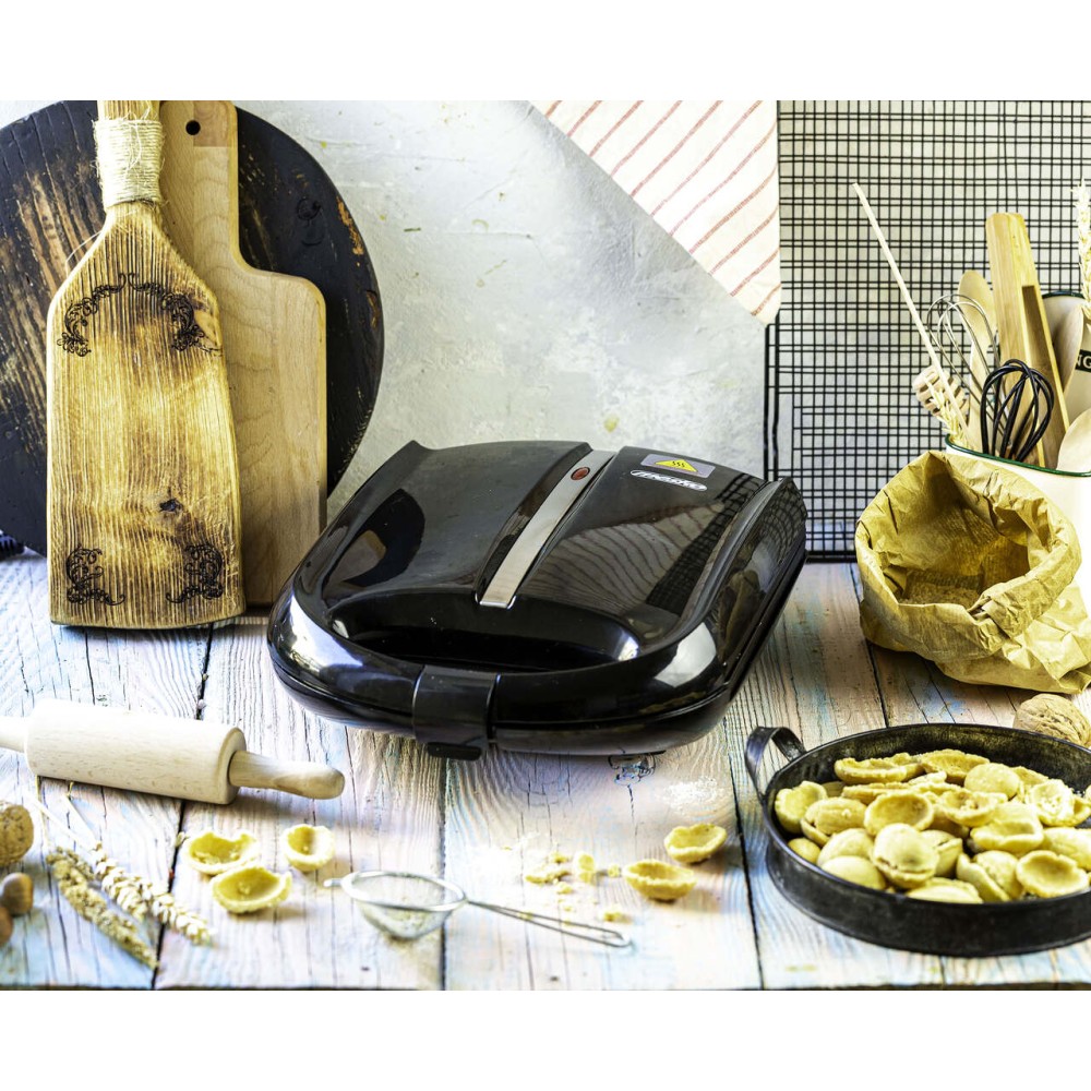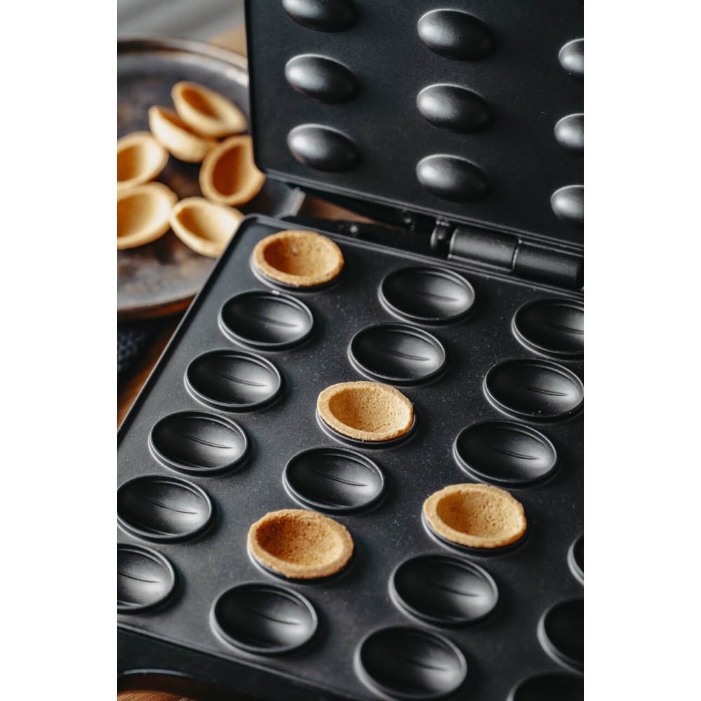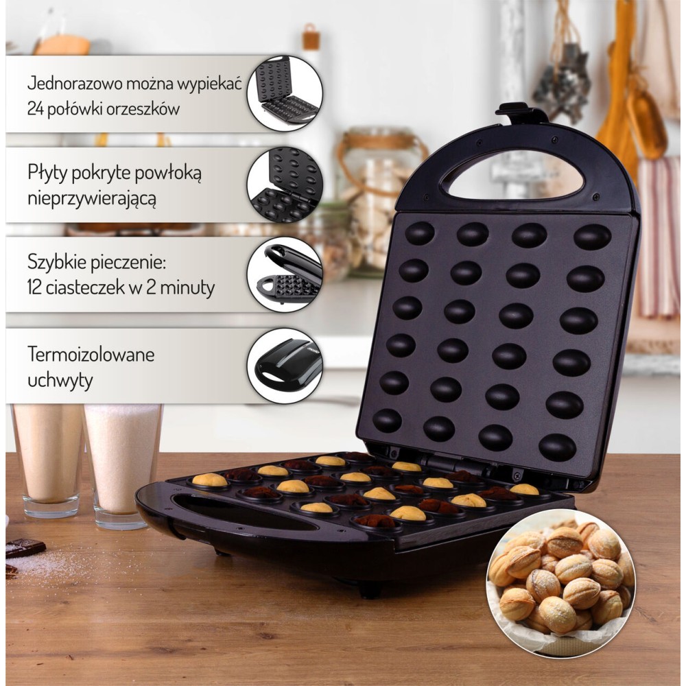 Un aparat pentru coacerea prăjiturilor sub formă de nuci umplute cu cremă în funcție de preferințele dvs. dulci sau uscate. Dimensiunea XL permite coacerea a până la 24 de jumătăți de nuci într-un singur ciclu. Carcasa din bachelită, mânerele termoizolate și acoperirea antiaderentă a plăcii de încălzire fac ca produsul să fie confortabil de utilizat. Puterea mare de până la 1600 W va coace un lot de prăjituri în maximum 2 minute.
