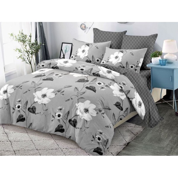 Lenjerie pat dublu, FINET, cu elastic, 6 piese, Gri, flori, Primavara Casa, cod produs: CFE121