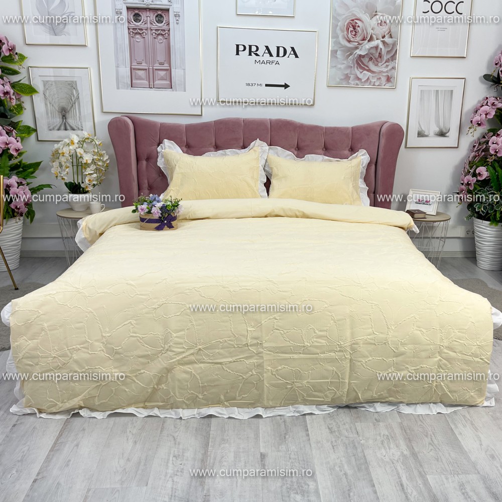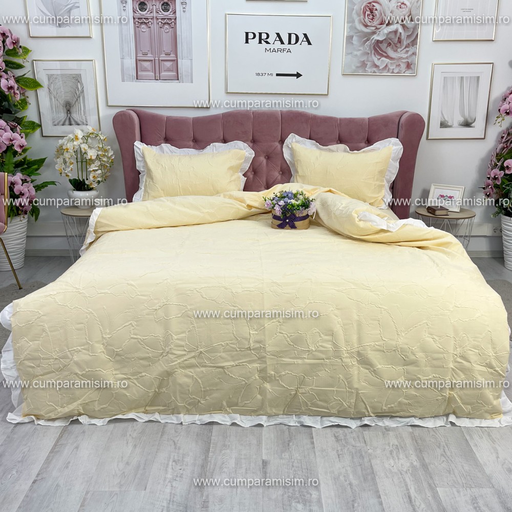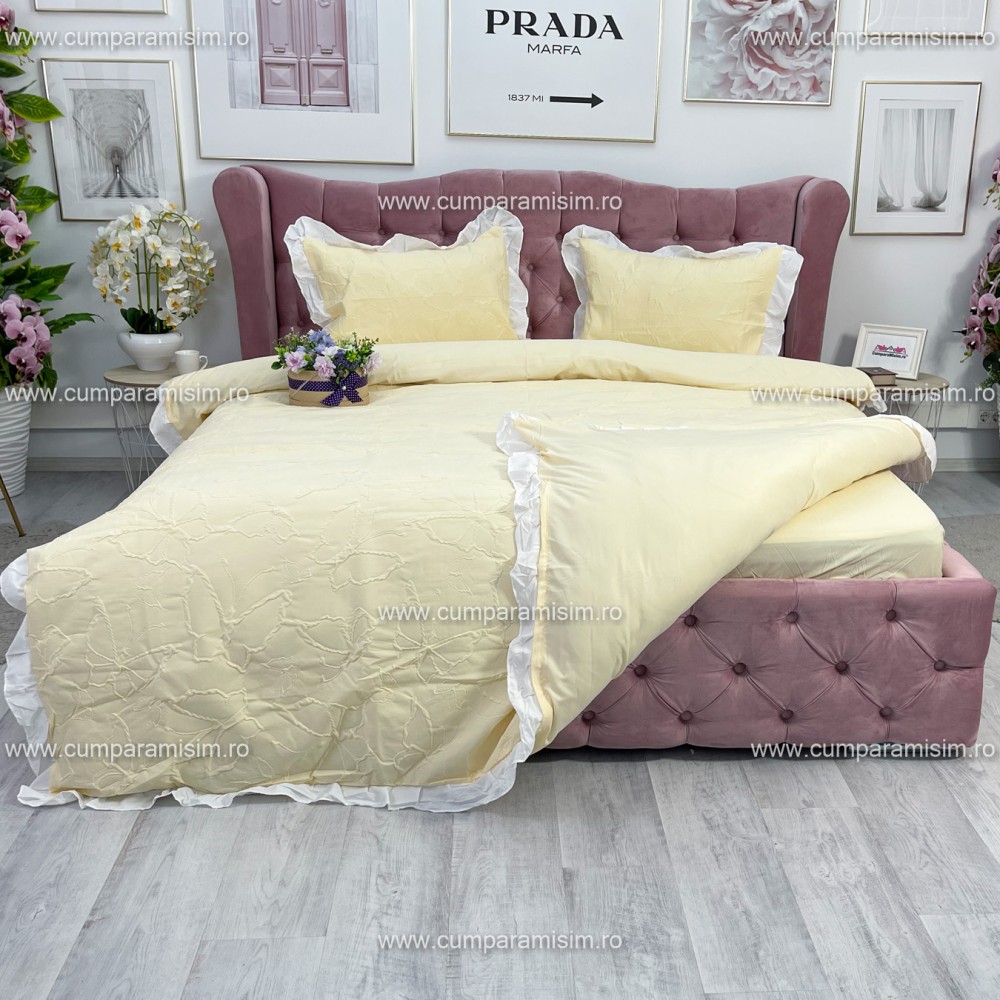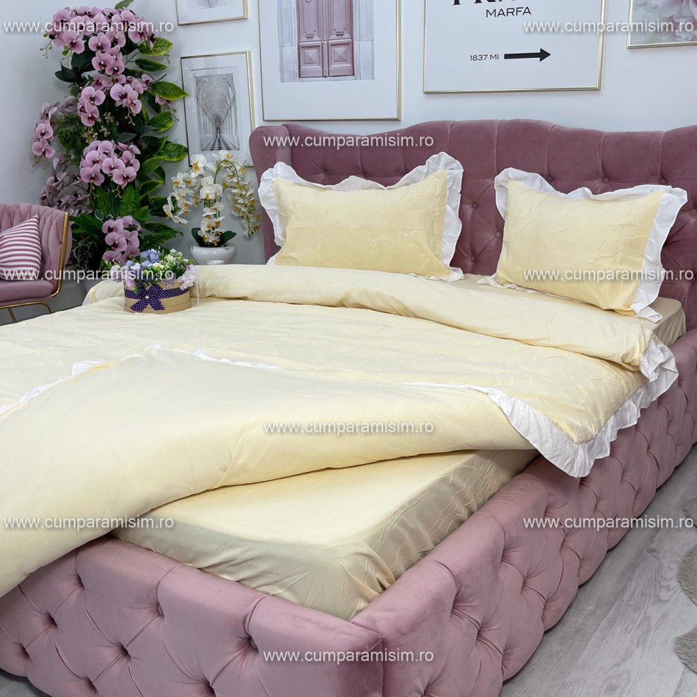 Lenjerie pat dublu, FINET, cu Broderie si Volanase, 4 piese, cu Elastic, galben deschis, Primavara Casa, cod produs: PRC19