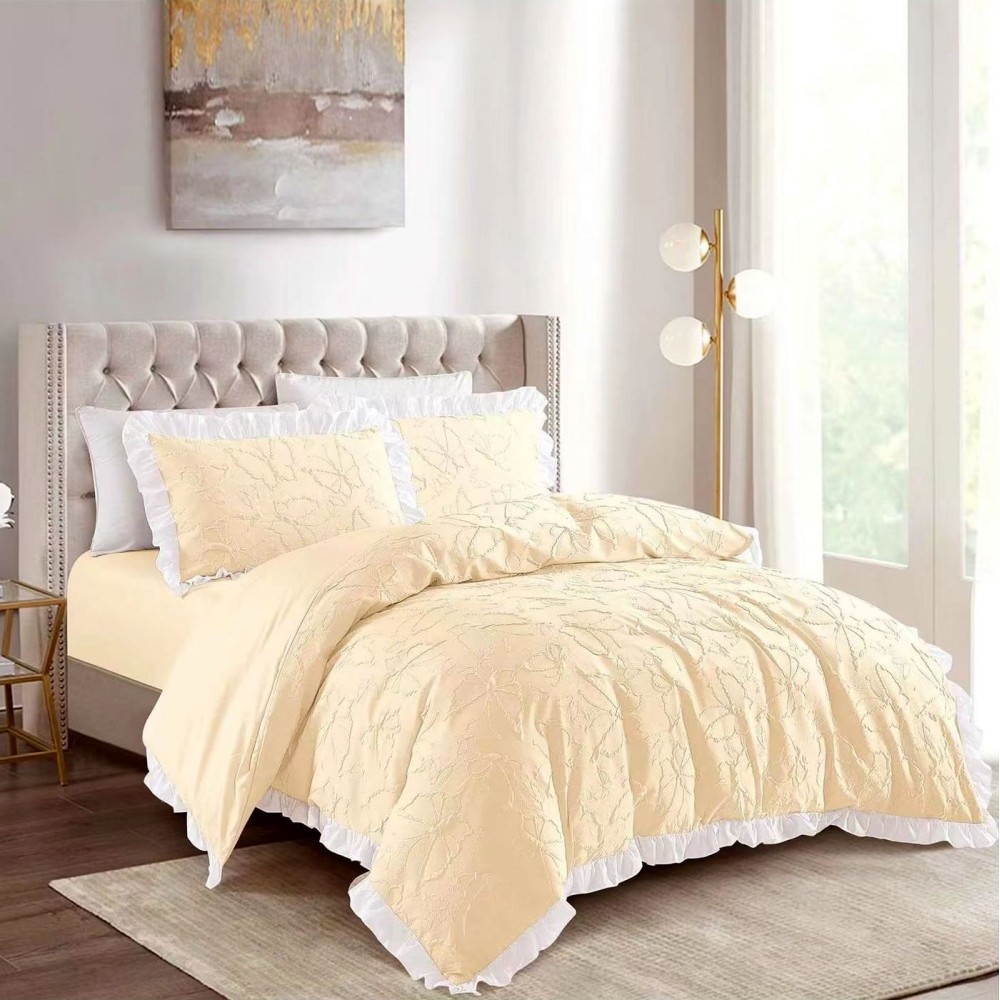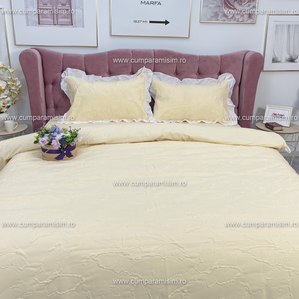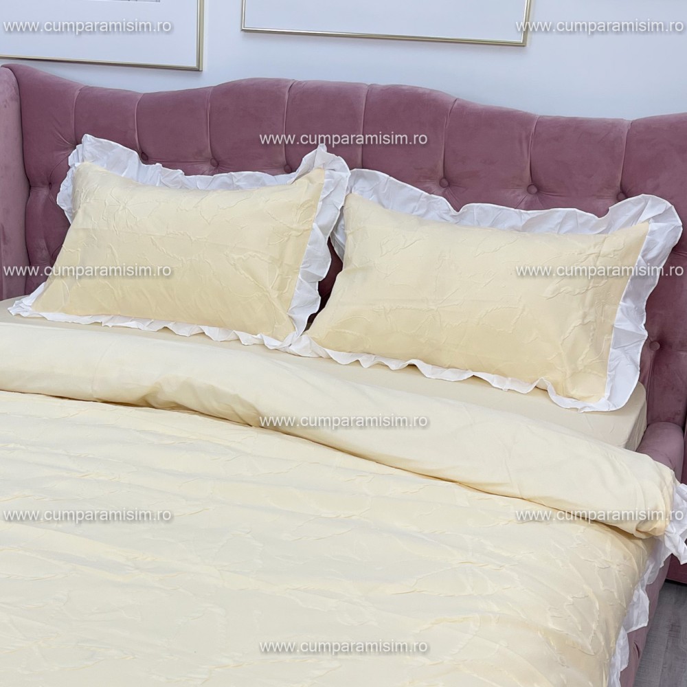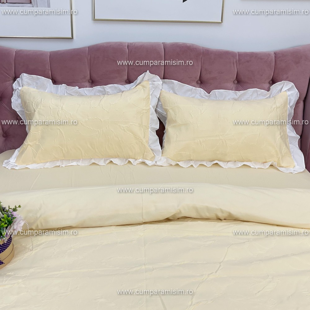 Lenjerie pat dublu, FINET, cu Broderie si Volanase, 4 piese, cu Elastic, galben deschis, Primavara Casa, cod produs: PRC19