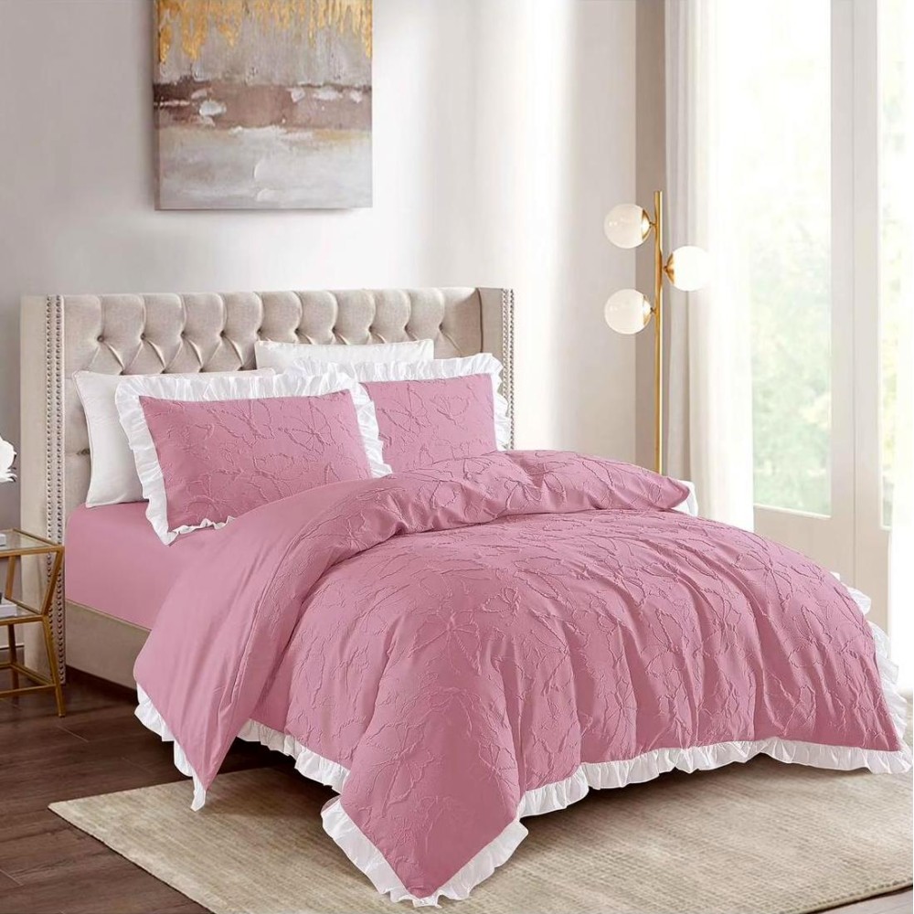 Lenjerie pat dublu, FINET, cu Broderie si Volanase, 4 piese, cu Elastic, roz pudra, Primavara Casa, cod produs: PRC16