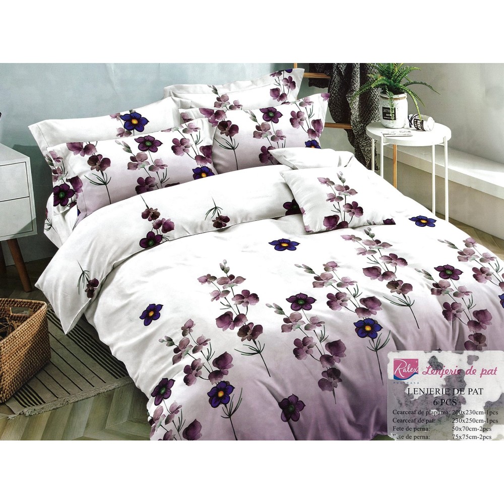 Lenjerie pat dublu, Ralex Pucioasa, Bumbac Finet, 6 piese, Alb-Mov, flori, cod produs: RXF101