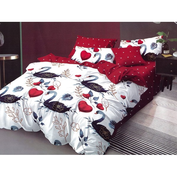 Lenjerie pat dublu, Ralex Pucioasa, Finet, 6 piese, cu elastic, Alb-Rosu, lebede, inimioare, cod produs: RXF577