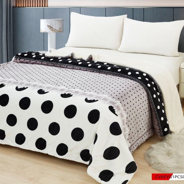 Pătură Luxoasă Cocolino din Microfibră Ultra-Moale, cu Blăniță Sherpa, 200x230 cm - Confort Maxim și Design Elegant pentru Nopți Perfecte, Alb, Negru, Buline, JOJO Home, cod produs: SDP-PB15