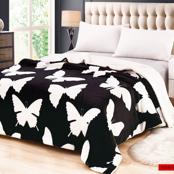 Pătură Luxoasă Cocolino din Microfibră Ultra-Moale, cu Blăniță Sherpa, 200x230 cm - Confort Maxim și Design Elegant pentru Nopți Perfecte, Negru, Alb, Fluturi, JOJO Home, cod produs: SDP-PB17
