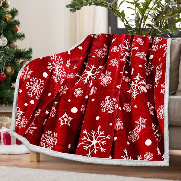 Patura pufoasa cocolino, cu BLANITA, 200x230cm, Craciun, Rosu, Alb, fulgi de nea, CumparaMisim, cod produs: SKP5