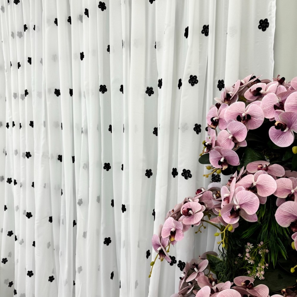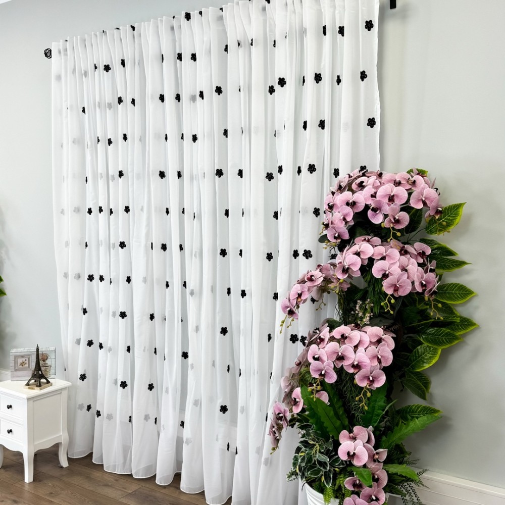 Perdea Floris din Voal Brodat - 600cm x 245cm , Rejansa pt. bara , model cu flori negre, Alb, CumparaMisim, cod produs: BPDs301A