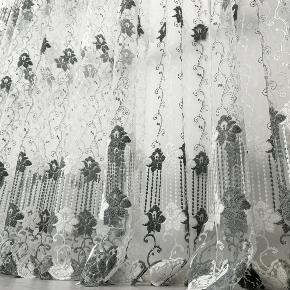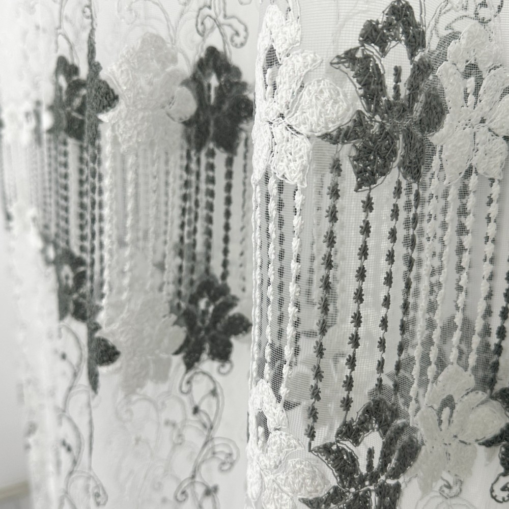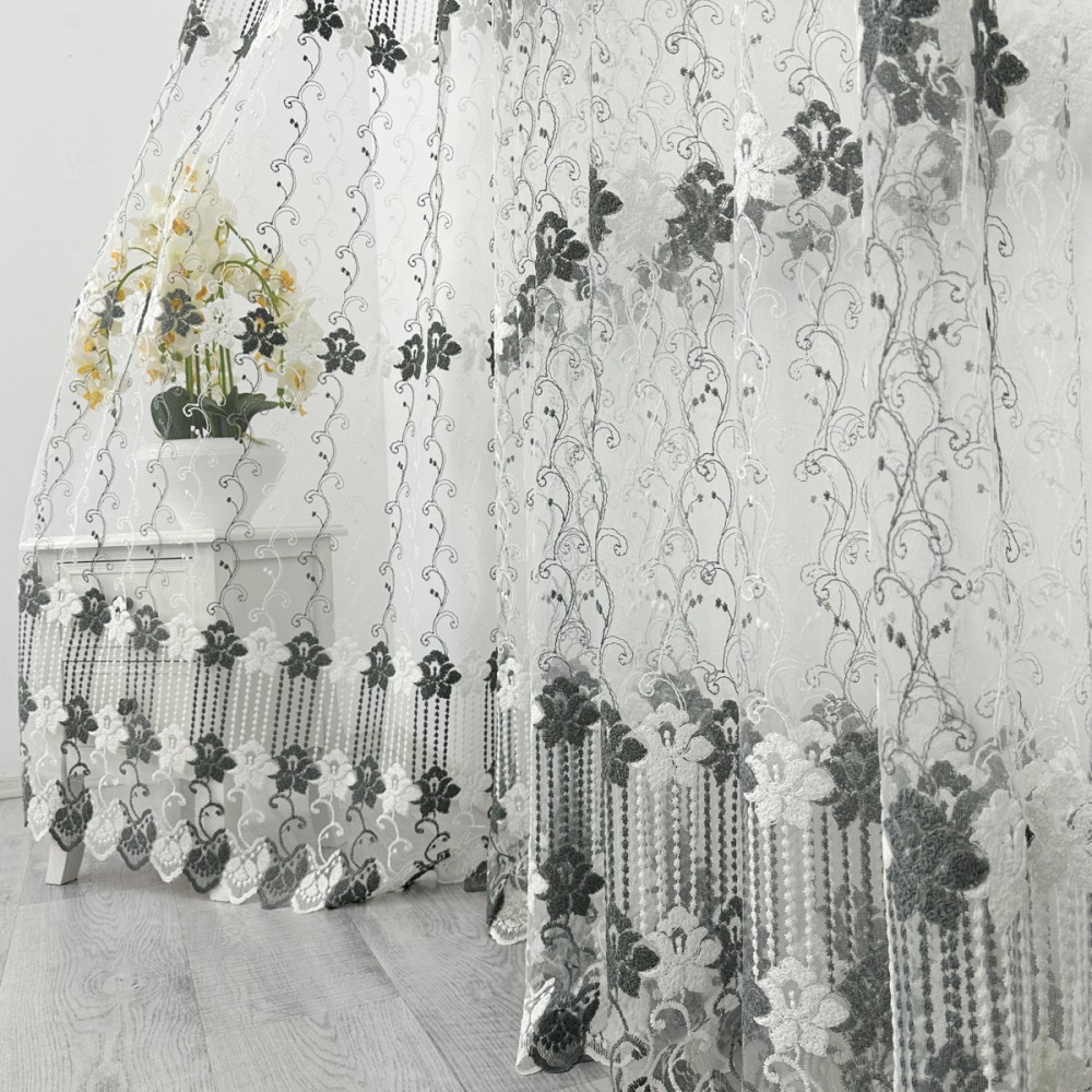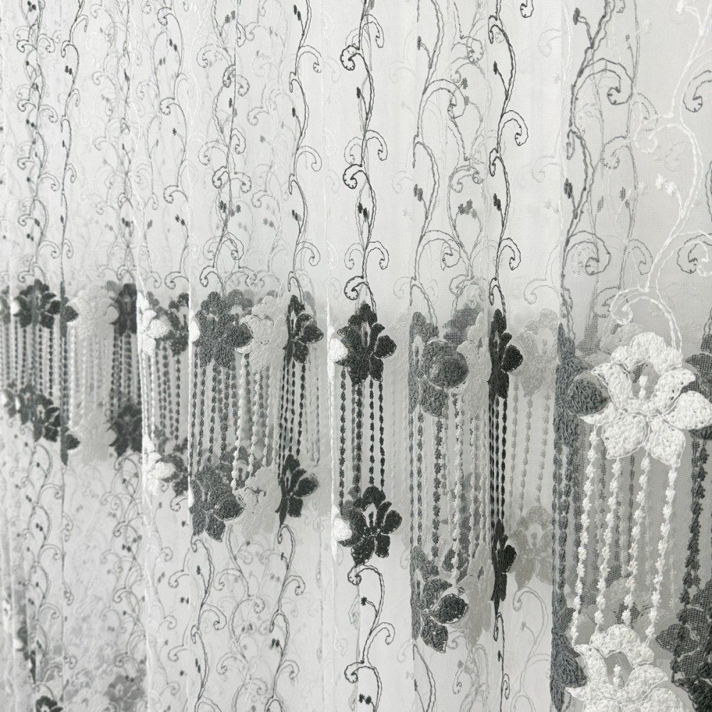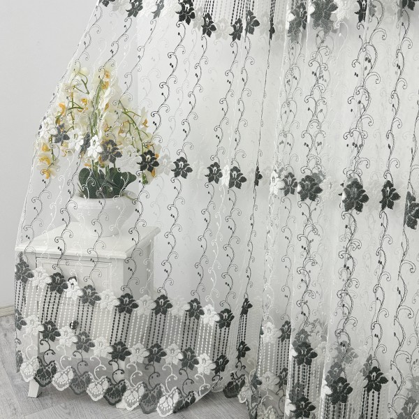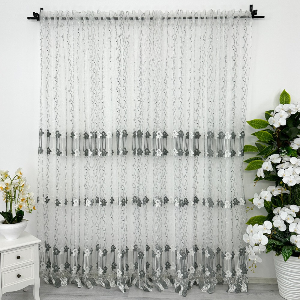 Perdea Grace din Tulle cu Broderie, model floral, Alb - Gri, 5m latime x 232cm inaltime x rejansa pt bara, CumparaMisim, cod produs: BPDs32a