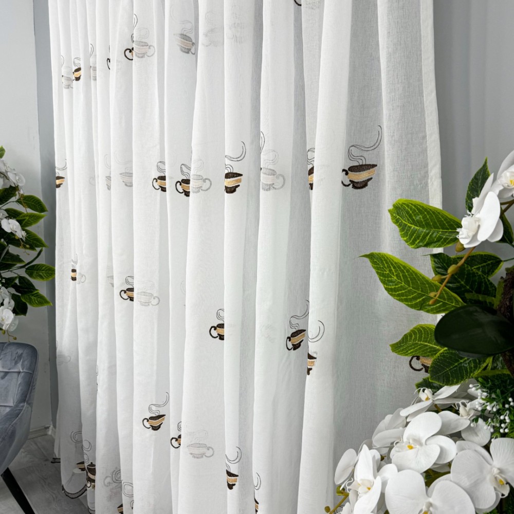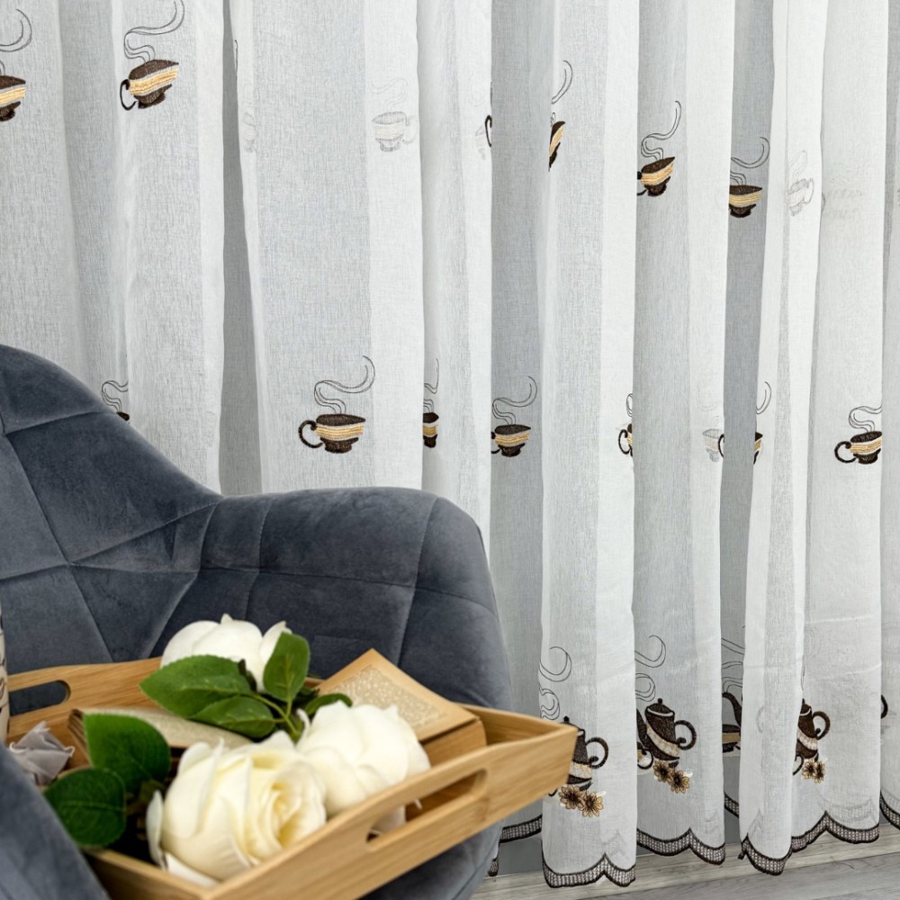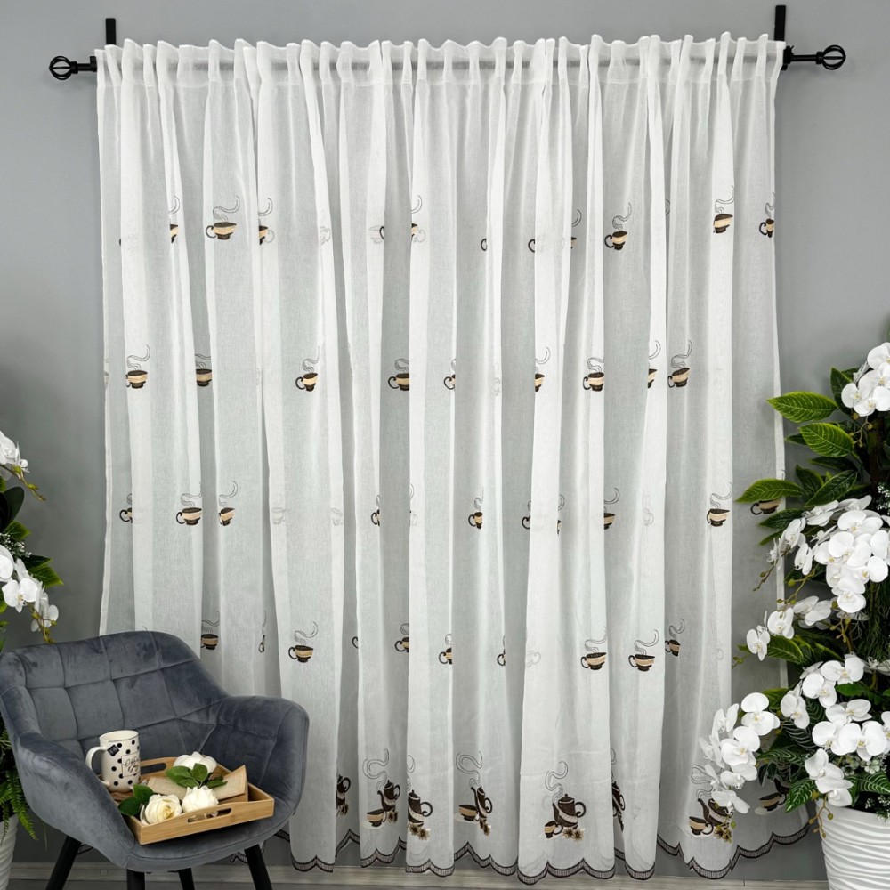 Perdea pentru Bucatarie din IN brodat, Alb cu Cafea V3, 200cm latime x 200cm inaltime, cu rejansa pentru bara, CumparaMisim, cod produs: BPDs204a