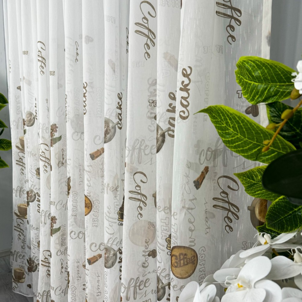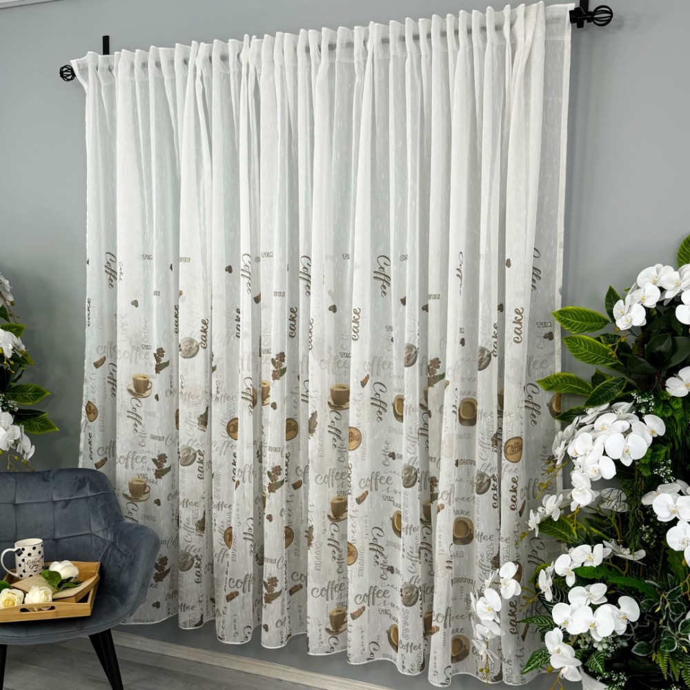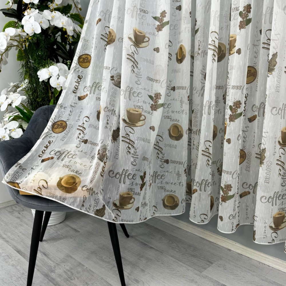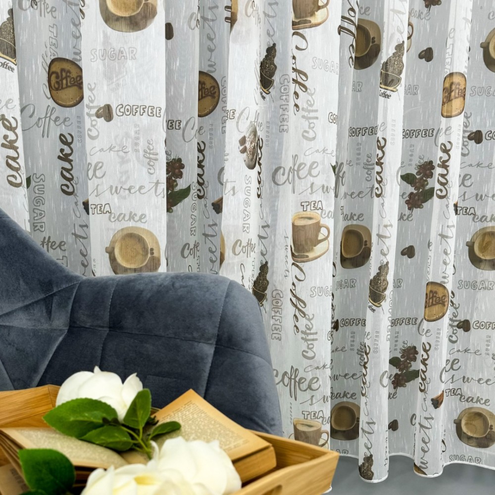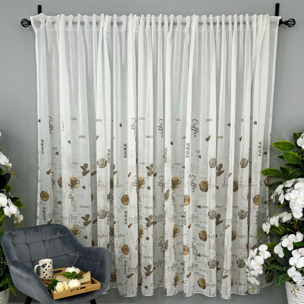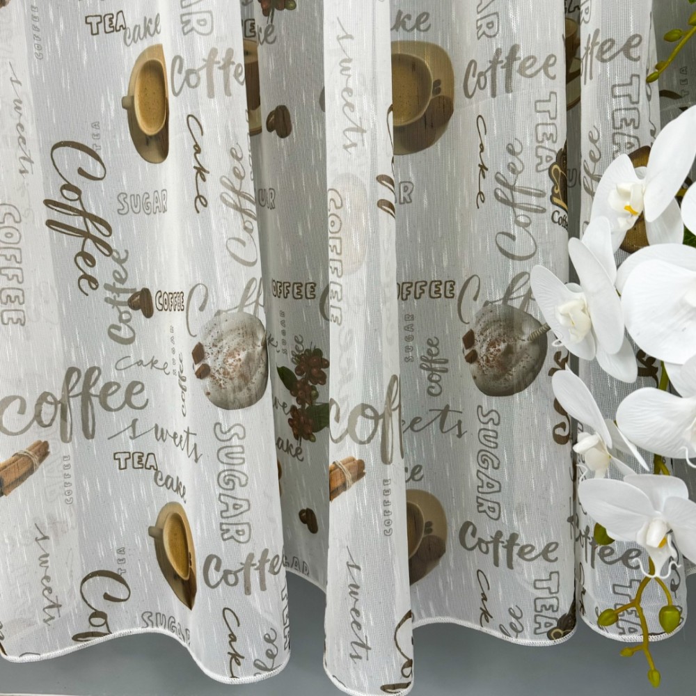 Perdea pentru Bucatarie din IN imprimat, Alb cu cafea, 100cm latime x 150cm inaltime , Rejansa pentru bara, CumparaMisim, cod produs: CSR-PDs66c