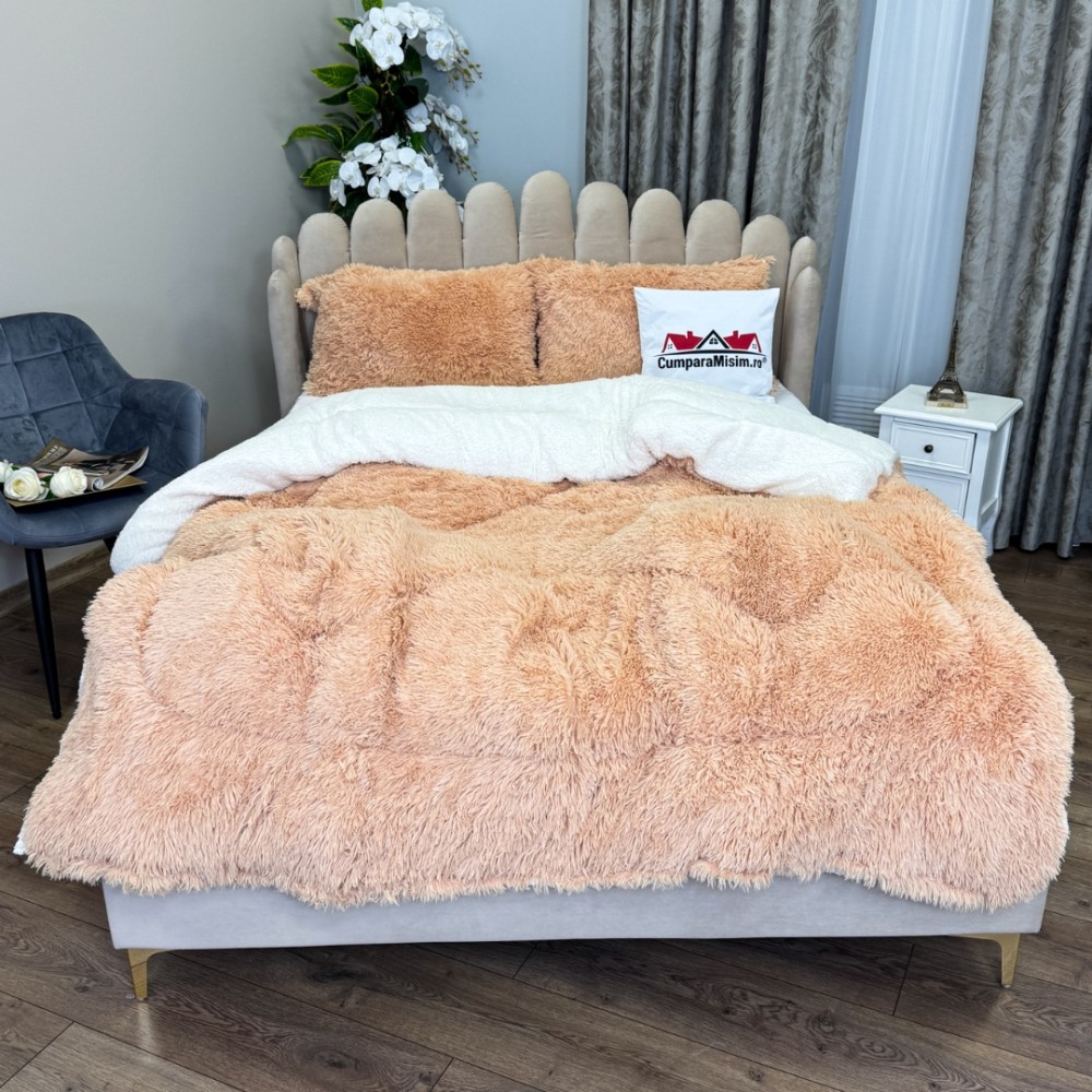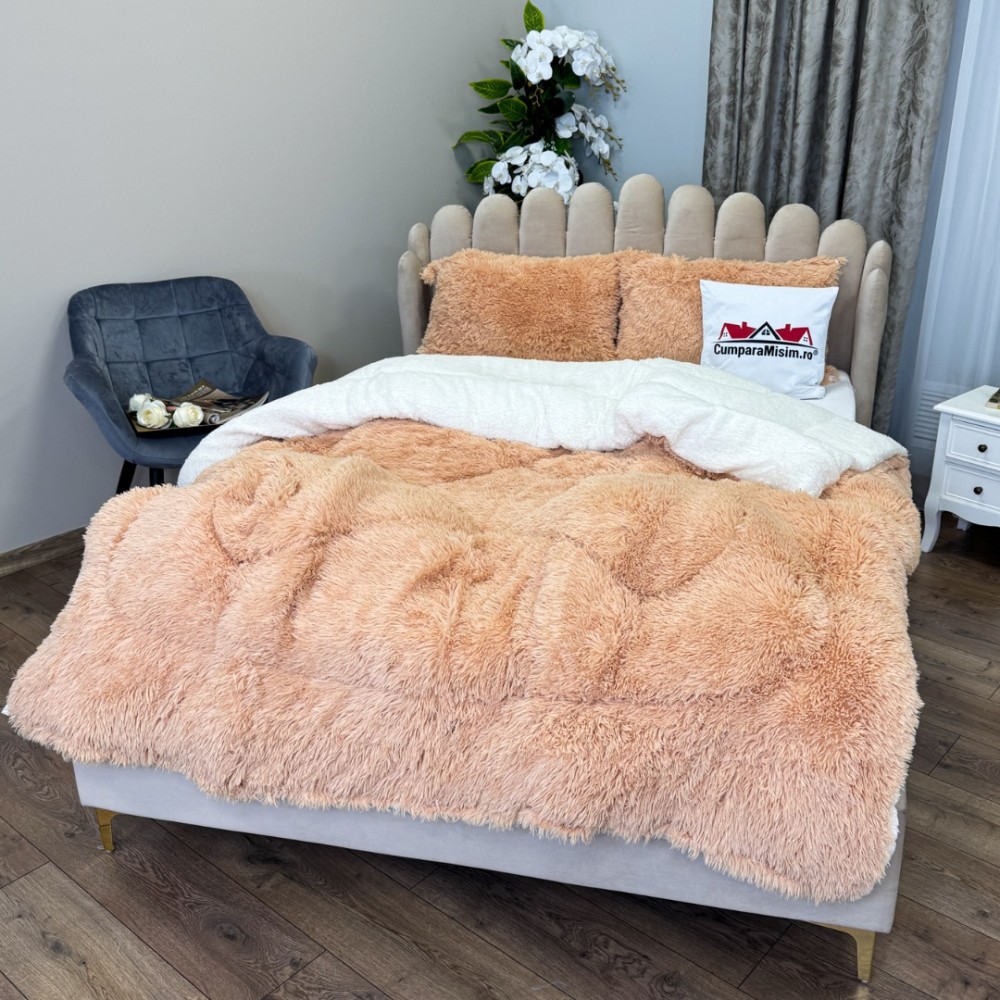 Pilota CoCoLiNo Fluffy, cu Blanita tip Sherpa, Alba, 200x230cm + 2 fete de perna 50x70cm, matlasata, Bej, cod produs: CSA-PFL07