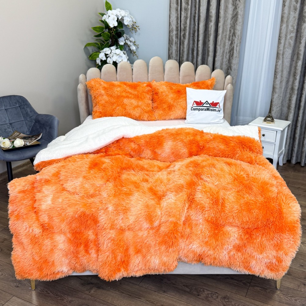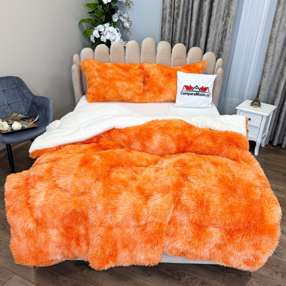 Pilota CoCoLiNo Fluffy, cu Blanita tip Sherpa, Alba, 200x230cm + 2 fete de perna 50x70cm, matlasata, Portocaliu, degrade, cod produs: CSA-PFL09