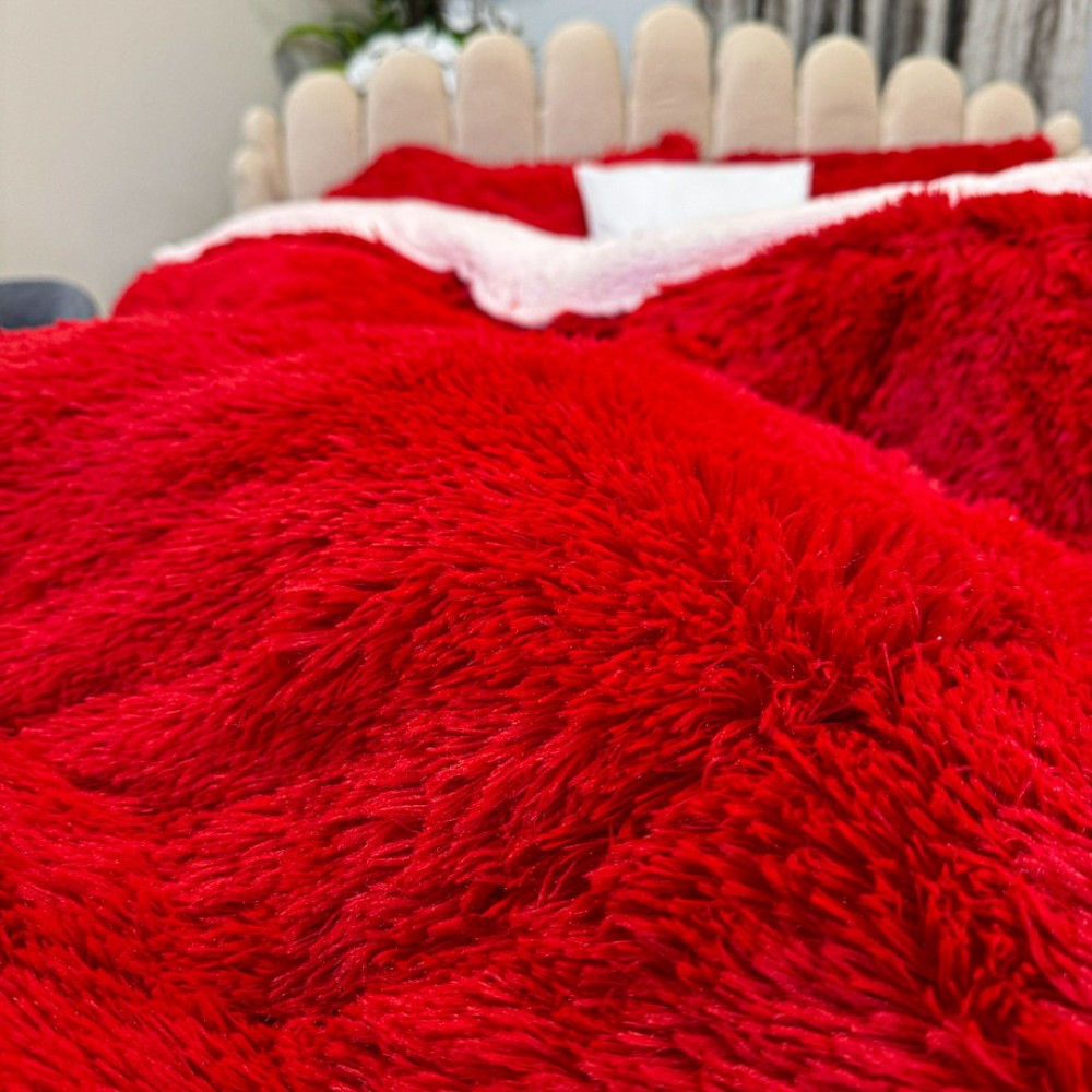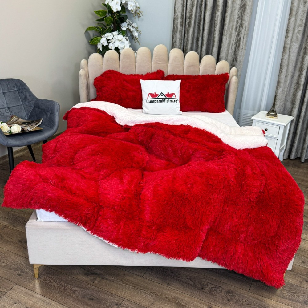 Pilota CoCoLiNo Fluffy, cu Blanita tip Sherpa, Alba, 200x230cm + 2 fete de perna 50x70cm, matlasata, Rosu, cod produs: CSA-PFL17