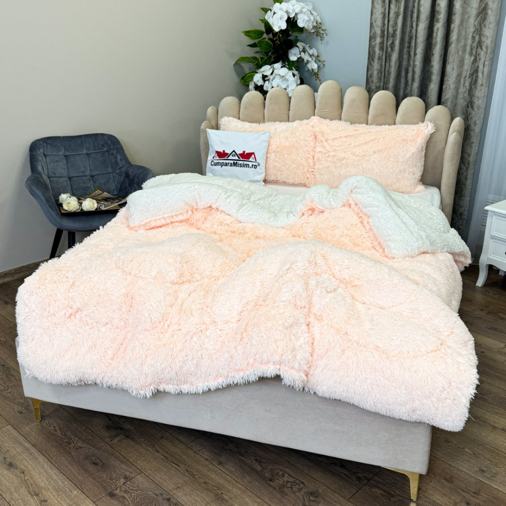 Pilota CoCoLiNo Fluffy, cu Blanita tip Sherpa, Alba, 200x230cm + 2 fete de perna 50x70cm, matlasata, Somon, cod produs: CSA-PFL18