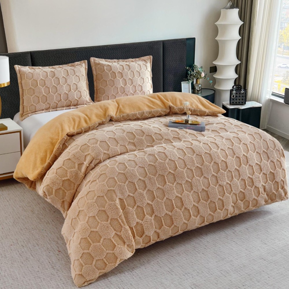 Pilota Groasă Cocolino Gofrat 3D Model în Relief cu Fagure și Dos din Blăniță Sherpa, Umplutură Vatelină Siliconică, 200x230 cm + 2 Fețe de Pernă 50x70 cm - Căldură și Rafinament pentru Un Somn Odihnitor, Bej, cod produs: BCC-PC403